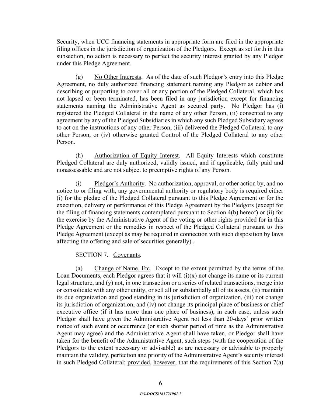 6 US-DOCS\163721961.7 Security, when UCC financing statements in appropriate form are filed in the appropriate filing offices in the jurisdiction of organization of the Pledgors. Except as set forth in this subsection, no action is necessary to perfect the security interest granted by any Pledgor under this Pledge Agreement. (g) No Other Interests. As of the date of such Pledgor’s entry into this Pledge Agreement, no duly authorized financing statement naming any Pledgor as debtor and describing or purporting to cover all or any portion of the Pledged Collateral, which has not lapsed or been terminated, has been filed in any jurisdiction except for financing statements naming the Administrative Agent as secured party. No Pledgor has (i) registered the Pledged Collateral in the name of any other Person, (ii) consented to any agreement by any of the Pledged Subsidiaries in which any such Pledged Subsidiary agrees to act on the instructions of any other Person, (iii) delivered the Pledged Collateral to any other Person, or (iv) otherwise granted Control of the Pledged Collateral to any other Person. (h) Authorization of Equity Interest. All Equity Interests which constitute Pledged Collateral are duly authorized, validly issued, and if applicable, fully paid and nonassessable and are not subject to preemptive rights of any Person. (i) Pledgor’s Authority. No authorization, approval, or other action by, and no notice to or filing with, any governmental authority or regulatory body is required either (i) for the pledge of the Pledged Collateral pursuant to this Pledge Agreement or for the execution, delivery or performance of this Pledge Agreement by the Pledgors (except for the filing of financing statements contemplated pursuant to Section 4(b) hereof) or (ii) for the exercise by the Administrative Agent of the voting or other rights provided for in this Pledge Agreement or the remedies in respect of the Pledged Collateral pursuant to this Pledge Agreement (except as may be required in connection with such disposition by laws affecting the offering and sale of securities generally).. SECTION 7. Covenants. (a) Change of Name, Etc. Except to the extent permitted by the terms of the Loan Documents, each Pledgor agrees that it will (i)(x) not change its name or its current legal structure, and (y) not, in one transaction or a series of related transactions, merge into or consolidate with any other entity, or sell all or substantially all of its assets, (ii) maintain its due organization and good standing in its jurisdiction of organization, (iii) not change its jurisdiction of organization, and (iv) not change its principal place of business or chief executive office (if it has more than one place of business), in each case, unless such Pledgor shall have given the Administrative Agent not less than 20-days’ prior written notice of such event or occurrence (or such shorter period of time as the Administrative Agent may agree) and the Administrative Agent shall have taken, or Pledgor shall have taken for the benefit of the Administrative Agent, such steps (with the cooperation of the Pledgors to the extent necessary or advisable) as are necessary or advisable to properly maintain the validity, perfection and priority of the Administrative Agent’s security interest in such Pledged Collateral; provided, however, that the requirements of this Section 7(a)