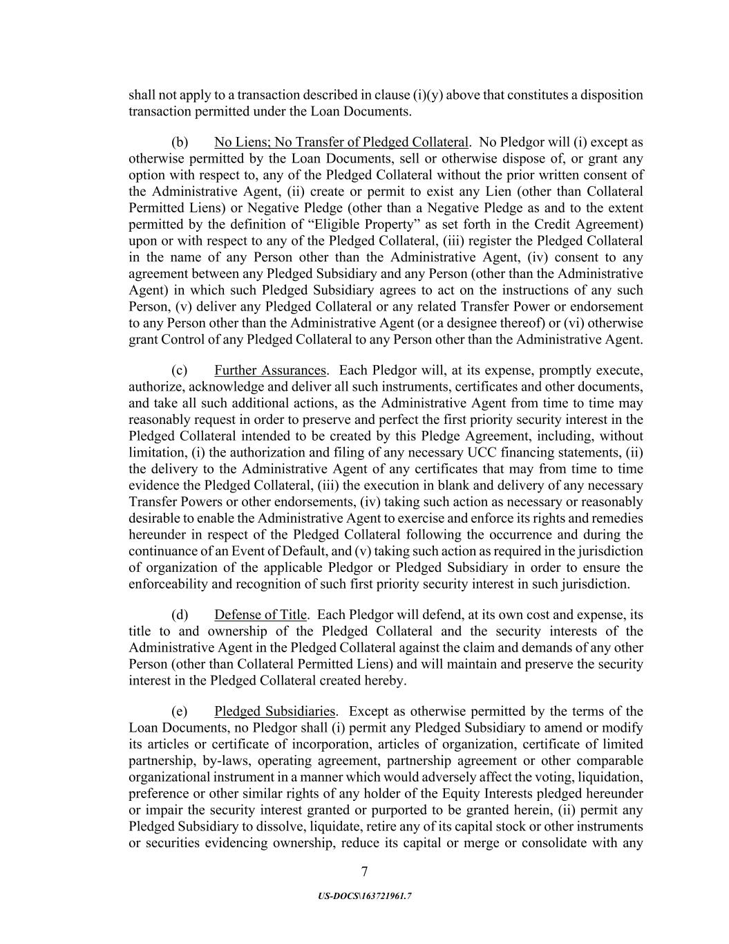 7 US-DOCS\163721961.7 shall not apply to a transaction described in clause (i)(y) above that constitutes a disposition transaction permitted under the Loan Documents. (b) No Liens; No Transfer of Pledged Collateral. No Pledgor will (i) except as otherwise permitted by the Loan Documents, sell or otherwise dispose of, or grant any option with respect to, any of the Pledged Collateral without the prior written consent of the Administrative Agent, (ii) create or permit to exist any Lien (other than Collateral Permitted Liens) or Negative Pledge (other than a Negative Pledge as and to the extent permitted by the definition of “Eligible Property” as set forth in the Credit Agreement) upon or with respect to any of the Pledged Collateral, (iii) register the Pledged Collateral in the name of any Person other than the Administrative Agent, (iv) consent to any agreement between any Pledged Subsidiary and any Person (other than the Administrative Agent) in which such Pledged Subsidiary agrees to act on the instructions of any such Person, (v) deliver any Pledged Collateral or any related Transfer Power or endorsement to any Person other than the Administrative Agent (or a designee thereof) or (vi) otherwise grant Control of any Pledged Collateral to any Person other than the Administrative Agent. (c) Further Assurances. Each Pledgor will, at its expense, promptly execute, authorize, acknowledge and deliver all such instruments, certificates and other documents, and take all such additional actions, as the Administrative Agent from time to time may reasonably request in order to preserve and perfect the first priority security interest in the Pledged Collateral intended to be created by this Pledge Agreement, including, without limitation, (i) the authorization and filing of any necessary UCC financing statements, (ii) the delivery to the Administrative Agent of any certificates that may from time to time evidence the Pledged Collateral, (iii) the execution in blank and delivery of any necessary Transfer Powers or other endorsements, (iv) taking such action as necessary or reasonably desirable to enable the Administrative Agent to exercise and enforce its rights and remedies hereunder in respect of the Pledged Collateral following the occurrence and during the continuance of an Event of Default, and (v) taking such action as required in the jurisdiction of organization of the applicable Pledgor or Pledged Subsidiary in order to ensure the enforceability and recognition of such first priority security interest in such jurisdiction. (d) Defense of Title. Each Pledgor will defend, at its own cost and expense, its title to and ownership of the Pledged Collateral and the security interests of the Administrative Agent in the Pledged Collateral against the claim and demands of any other Person (other than Collateral Permitted Liens) and will maintain and preserve the security interest in the Pledged Collateral created hereby. (e) Pledged Subsidiaries. Except as otherwise permitted by the terms of the Loan Documents, no Pledgor shall (i) permit any Pledged Subsidiary to amend or modify its articles or certificate of incorporation, articles of organization, certificate of limited partnership, by-laws, operating agreement, partnership agreement or other comparable organizational instrument in a manner which would adversely affect the voting, liquidation, preference or other similar rights of any holder of the Equity Interests pledged hereunder or impair the security interest granted or purported to be granted herein, (ii) permit any Pledged Subsidiary to dissolve, liquidate, retire any of its capital stock or other instruments or securities evidencing ownership, reduce its capital or merge or consolidate with any