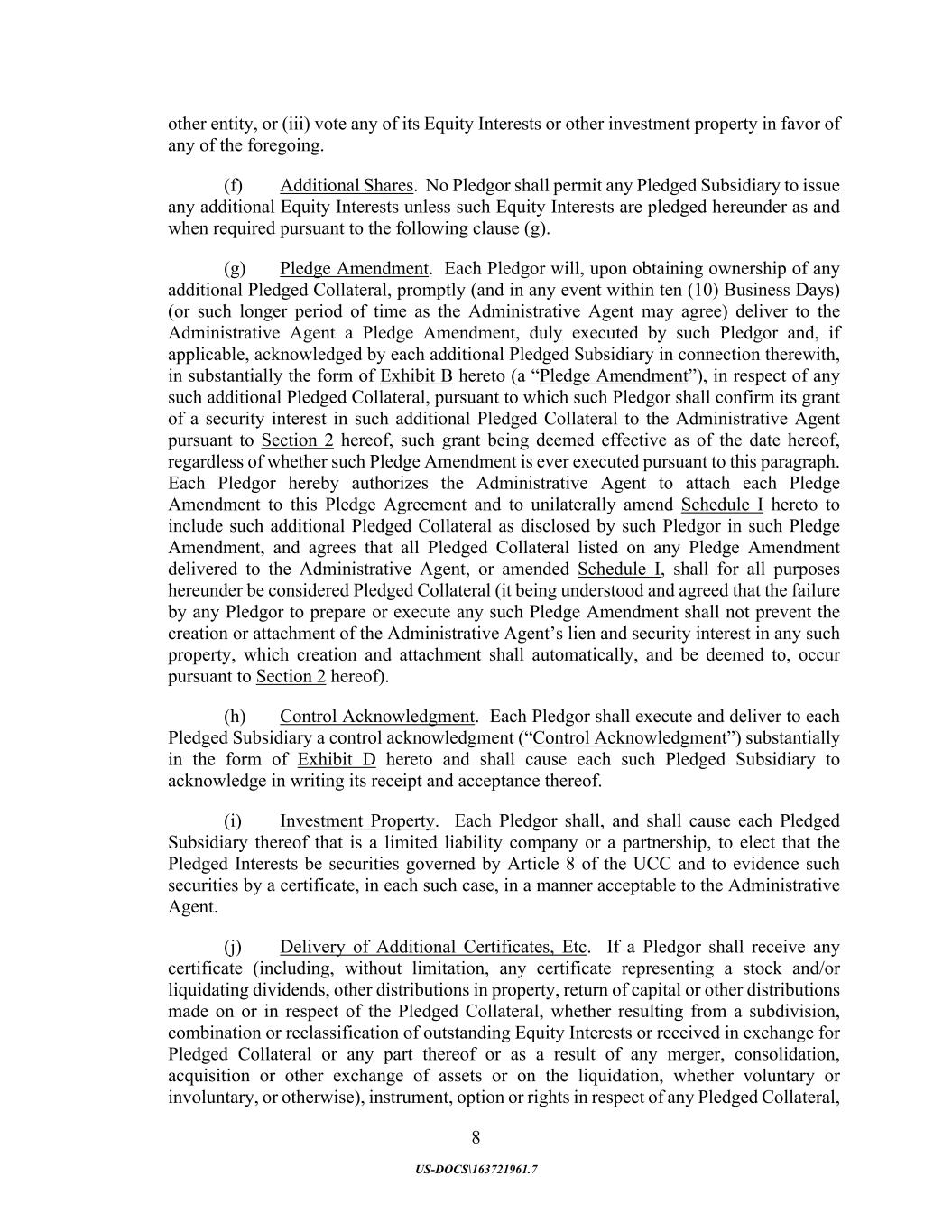 8 US-DOCS\163721961.7 other entity, or (iii) vote any of its Equity Interests or other investment property in favor of any of the foregoing. (f) Additional Shares. No Pledgor shall permit any Pledged Subsidiary to issue any additional Equity Interests unless such Equity Interests are pledged hereunder as and when required pursuant to the following clause (g). (g) Pledge Amendment. Each Pledgor will, upon obtaining ownership of any additional Pledged Collateral, promptly (and in any event within ten (10) Business Days) (or such longer period of time as the Administrative Agent may agree) deliver to the Administrative Agent a Pledge Amendment, duly executed by such Pledgor and, if applicable, acknowledged by each additional Pledged Subsidiary in connection therewith, in substantially the form of Exhibit B hereto (a “Pledge Amendment”), in respect of any such additional Pledged Collateral, pursuant to which such Pledgor shall confirm its grant of a security interest in such additional Pledged Collateral to the Administrative Agent pursuant to Section 2 hereof, such grant being deemed effective as of the date hereof, regardless of whether such Pledge Amendment is ever executed pursuant to this paragraph. Each Pledgor hereby authorizes the Administrative Agent to attach each Pledge Amendment to this Pledge Agreement and to unilaterally amend Schedule I hereto to include such additional Pledged Collateral as disclosed by such Pledgor in such Pledge Amendment, and agrees that all Pledged Collateral listed on any Pledge Amendment delivered to the Administrative Agent, or amended Schedule I, shall for all purposes hereunder be considered Pledged Collateral (it being understood and agreed that the failure by any Pledgor to prepare or execute any such Pledge Amendment shall not prevent the creation or attachment of the Administrative Agent’s lien and security interest in any such property, which creation and attachment shall automatically, and be deemed to, occur pursuant to Section 2 hereof). (h) Control Acknowledgment. Each Pledgor shall execute and deliver to each Pledged Subsidiary a control acknowledgment (“Control Acknowledgment”) substantially in the form of Exhibit D hereto and shall cause each such Pledged Subsidiary to acknowledge in writing its receipt and acceptance thereof. (i) Investment Property. Each Pledgor shall, and shall cause each Pledged Subsidiary thereof that is a limited liability company or a partnership, to elect that the Pledged Interests be securities governed by Article 8 of the UCC and to evidence such securities by a certificate, in each such case, in a manner acceptable to the Administrative Agent. (j) Delivery of Additional Certificates, Etc. If a Pledgor shall receive any certificate (including, without limitation, any certificate representing a stock and/or liquidating dividends, other distributions in property, return of capital or other distributions made on or in respect of the Pledged Collateral, whether resulting from a subdivision, combination or reclassification of outstanding Equity Interests or received in exchange for Pledged Collateral or any part thereof or as a result of any merger, consolidation, acquisition or other exchange of assets or on the liquidation, whether voluntary or involuntary, or otherwise), instrument, option or rights in respect of any Pledged Collateral,
