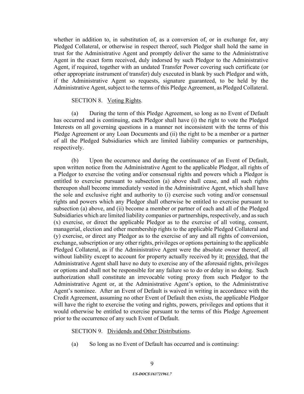9 US-DOCS\163721961.7 whether in addition to, in substitution of, as a conversion of, or in exchange for, any Pledged Collateral, or otherwise in respect thereof, such Pledgor shall hold the same in trust for the Administrative Agent and promptly deliver the same to the Administrative Agent in the exact form received, duly indorsed by such Pledgor to the Administrative Agent, if required, together with an undated Transfer Power covering such certificate (or other appropriate instrument of transfer) duly executed in blank by such Pledgor and with, if the Administrative Agent so requests, signature guaranteed, to be held by the Administrative Agent, subject to the terms of this Pledge Agreement, as Pledged Collateral. SECTION 8. Voting Rights. (a) During the term of this Pledge Agreement, so long as no Event of Default has occurred and is continuing, each Pledgor shall have (i) the right to vote the Pledged Interests on all governing questions in a manner not inconsistent with the terms of this Pledge Agreement or any Loan Documents and (ii) the right to be a member or a partner of all the Pledged Subsidiaries which are limited liability companies or partnerships, respectively. (b) Upon the occurrence and during the continuance of an Event of Default, upon written notice from the Administrative Agent to the applicable Pledgor, all rights of a Pledgor to exercise the voting and/or consensual rights and powers which a Pledgor is entitled to exercise pursuant to subsection (a) above shall cease, and all such rights thereupon shall become immediately vested in the Administrative Agent, which shall have the sole and exclusive right and authority to (i) exercise such voting and/or consensual rights and powers which any Pledgor shall otherwise be entitled to exercise pursuant to subsection (a) above, and (ii) become a member or partner of each and all of the Pledged Subsidiaries which are limited liability companies or partnerships, respectively, and as such (x) exercise, or direct the applicable Pledgor as to the exercise of all voting, consent, managerial, election and other membership rights to the applicable Pledged Collateral and (y) exercise, or direct any Pledgor as to the exercise of any and all rights of conversion, exchange, subscription or any other rights, privileges or options pertaining to the applicable Pledged Collateral, as if the Administrative Agent were the absolute owner thereof, all without liability except to account for property actually received by it; provided, that the Administrative Agent shall have no duty to exercise any of the aforesaid rights, privileges or options and shall not be responsible for any failure so to do or delay in so doing. Such authorization shall constitute an irrevocable voting proxy from such Pledgor to the Administrative Agent or, at the Administrative Agent’s option, to the Administrative Agent’s nominee. After an Event of Default is waived in writing in accordance with the Credit Agreement, assuming no other Event of Default then exists, the applicable Pledgor will have the right to exercise the voting and rights, powers, privileges and options that it would otherwise be entitled to exercise pursuant to the terms of this Pledge Agreement prior to the occurrence of any such Event of Default. SECTION 9. Dividends and Other Distributions. (a) So long as no Event of Default has occurred and is continuing: