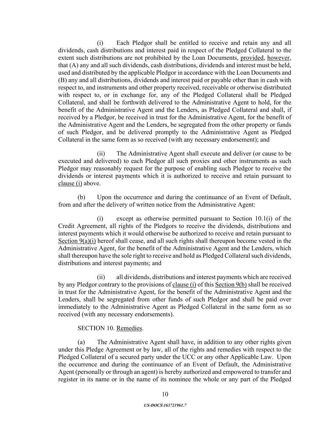 10 US-DOCS\163721961.7 (i) Each Pledgor shall be entitled to receive and retain any and all dividends, cash distributions and interest paid in respect of the Pledged Collateral to the extent such distributions are not prohibited by the Loan Documents, provided, however, that (A) any and all such dividends, cash distributions, dividends and interest must be held, used and distributed by the applicable Pledgor in accordance with the Loan Documents and (B) any and all distributions, dividends and interest paid or payable other than in cash with respect to, and instruments and other property received, receivable or otherwise distributed with respect to, or in exchange for, any of the Pledged Collateral shall be Pledged Collateral, and shall be forthwith delivered to the Administrative Agent to hold, for the benefit of the Administrative Agent and the Lenders, as Pledged Collateral and shall, if received by a Pledgor, be received in trust for the Administrative Agent, for the benefit of the Administrative Agent and the Lenders, be segregated from the other property or funds of such Pledgor, and be delivered promptly to the Administrative Agent as Pledged Collateral in the same form as so received (with any necessary endorsement); and (ii) The Administrative Agent shall execute and deliver (or cause to be executed and delivered) to each Pledgor all such proxies and other instruments as such Pledgor may reasonably request for the purpose of enabling such Pledgor to receive the dividends or interest payments which it is authorized to receive and retain pursuant to clause (i) above. (b) Upon the occurrence and during the continuance of an Event of Default, from and after the delivery of written notice from the Administrative Agent: (i) except as otherwise permitted pursuant to Section 10.1(i) of the Credit Agreement, all rights of the Pledgors to receive the dividends, distributions and interest payments which it would otherwise be authorized to receive and retain pursuant to Section 9(a)(i) hereof shall cease, and all such rights shall thereupon become vested in the Administrative Agent, for the benefit of the Administrative Agent and the Lenders, which shall thereupon have the sole right to receive and hold as Pledged Collateral such dividends, distributions and interest payments; and (ii) all dividends, distributions and interest payments which are received by any Pledgor contrary to the provisions of clause (i) of this Section 9(b) shall be received in trust for the Administrative Agent, for the benefit of the Administrative Agent and the Lenders, shall be segregated from other funds of such Pledgor and shall be paid over immediately to the Administrative Agent as Pledged Collateral in the same form as so received (with any necessary endorsements). SECTION 10. Remedies. (a) The Administrative Agent shall have, in addition to any other rights given under this Pledge Agreement or by law, all of the rights and remedies with respect to the Pledged Collateral of a secured party under the UCC or any other Applicable Law. Upon the occurrence and during the continuance of an Event of Default, the Administrative Agent (personally or through an agent) is hereby authorized and empowered to transfer and register in its name or in the name of its nominee the whole or any part of the Pledged