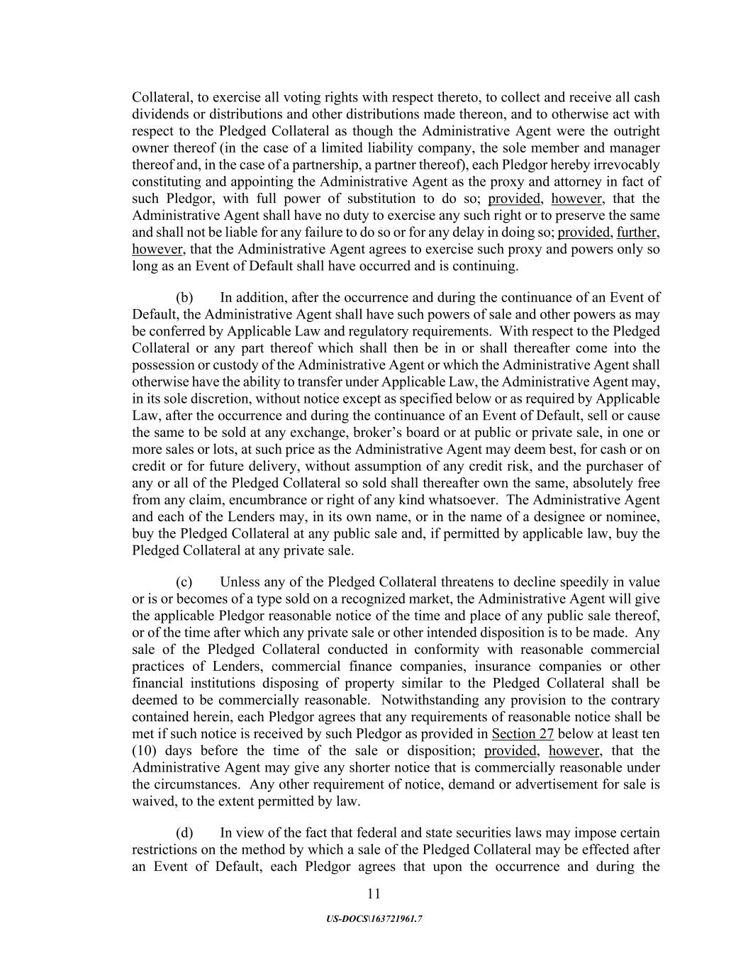 11 US-DOCS\163721961.7 Collateral, to exercise all voting rights with respect thereto, to collect and receive all cash dividends or distributions and other distributions made thereon, and to otherwise act with respect to the Pledged Collateral as though the Administrative Agent were the outright owner thereof (in the case of a limited liability company, the sole member and manager thereof and, in the case of a partnership, a partner thereof), each Pledgor hereby irrevocably constituting and appointing the Administrative Agent as the proxy and attorney in fact of such Pledgor, with full power of substitution to do so; provided, however, that the Administrative Agent shall have no duty to exercise any such right or to preserve the same and shall not be liable for any failure to do so or for any delay in doing so; provided, further, however, that the Administrative Agent agrees to exercise such proxy and powers only so long as an Event of Default shall have occurred and is continuing. (b) In addition, after the occurrence and during the continuance of an Event of Default, the Administrative Agent shall have such powers of sale and other powers as may be conferred by Applicable Law and regulatory requirements. With respect to the Pledged Collateral or any part thereof which shall then be in or shall thereafter come into the possession or custody of the Administrative Agent or which the Administrative Agent shall otherwise have the ability to transfer under Applicable Law, the Administrative Agent may, in its sole discretion, without notice except as specified below or as required by Applicable Law, after the occurrence and during the continuance of an Event of Default, sell or cause the same to be sold at any exchange, broker’s board or at public or private sale, in one or more sales or lots, at such price as the Administrative Agent may deem best, for cash or on credit or for future delivery, without assumption of any credit risk, and the purchaser of any or all of the Pledged Collateral so sold shall thereafter own the same, absolutely free from any claim, encumbrance or right of any kind whatsoever. The Administrative Agent and each of the Lenders may, in its own name, or in the name of a designee or nominee, buy the Pledged Collateral at any public sale and, if permitted by applicable law, buy the Pledged Collateral at any private sale. (c) Unless any of the Pledged Collateral threatens to decline speedily in value or is or becomes of a type sold on a recognized market, the Administrative Agent will give the applicable Pledgor reasonable notice of the time and place of any public sale thereof, or of the time after which any private sale or other intended disposition is to be made. Any sale of the Pledged Collateral conducted in conformity with reasonable commercial practices of Lenders, commercial finance companies, insurance companies or other financial institutions disposing of property similar to the Pledged Collateral shall be deemed to be commercially reasonable. Notwithstanding any provision to the contrary contained herein, each Pledgor agrees that any requirements of reasonable notice shall be met if such notice is received by such Pledgor as provided in Section 27 below at least ten (10) days before the time of the sale or disposition; provided, however, that the Administrative Agent may give any shorter notice that is commercially reasonable under the circumstances. Any other requirement of notice, demand or advertisement for sale is waived, to the extent permitted by law. (d) In view of the fact that federal and state securities laws may impose certain restrictions on the method by which a sale of the Pledged Collateral may be effected after an Event of Default, each Pledgor agrees that upon the occurrence and during the