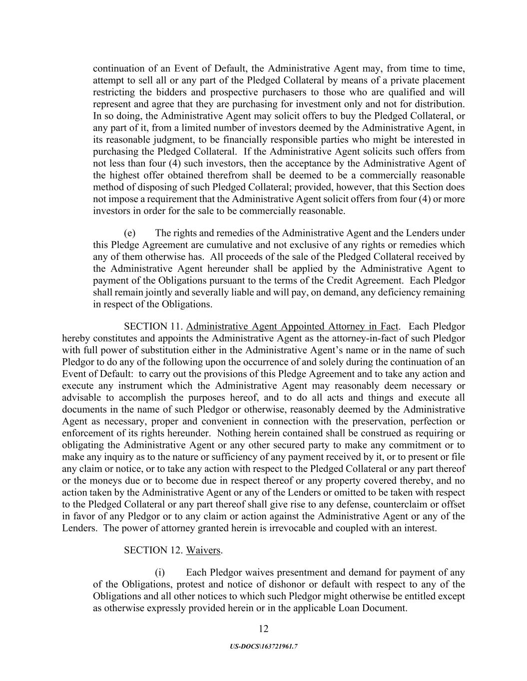 12 US-DOCS\163721961.7 continuation of an Event of Default, the Administrative Agent may, from time to time, attempt to sell all or any part of the Pledged Collateral by means of a private placement restricting the bidders and prospective purchasers to those who are qualified and will represent and agree that they are purchasing for investment only and not for distribution. In so doing, the Administrative Agent may solicit offers to buy the Pledged Collateral, or any part of it, from a limited number of investors deemed by the Administrative Agent, in its reasonable judgment, to be financially responsible parties who might be interested in purchasing the Pledged Collateral. If the Administrative Agent solicits such offers from not less than four (4) such investors, then the acceptance by the Administrative Agent of the highest offer obtained therefrom shall be deemed to be a commercially reasonable method of disposing of such Pledged Collateral; provided, however, that this Section does not impose a requirement that the Administrative Agent solicit offers from four (4) or more investors in order for the sale to be commercially reasonable. (e) The rights and remedies of the Administrative Agent and the Lenders under this Pledge Agreement are cumulative and not exclusive of any rights or remedies which any of them otherwise has. All proceeds of the sale of the Pledged Collateral received by the Administrative Agent hereunder shall be applied by the Administrative Agent to payment of the Obligations pursuant to the terms of the Credit Agreement. Each Pledgor shall remain jointly and severally liable and will pay, on demand, any deficiency remaining in respect of the Obligations. SECTION 11. Administrative Agent Appointed Attorney in Fact. Each Pledgor hereby constitutes and appoints the Administrative Agent as the attorney-in-fact of such Pledgor with full power of substitution either in the Administrative Agent’s name or in the name of such Pledgor to do any of the following upon the occurrence of and solely during the continuation of an Event of Default: to carry out the provisions of this Pledge Agreement and to take any action and execute any instrument which the Administrative Agent may reasonably deem necessary or advisable to accomplish the purposes hereof, and to do all acts and things and execute all documents in the name of such Pledgor or otherwise, reasonably deemed by the Administrative Agent as necessary, proper and convenient in connection with the preservation, perfection or enforcement of its rights hereunder. Nothing herein contained shall be construed as requiring or obligating the Administrative Agent or any other secured party to make any commitment or to make any inquiry as to the nature or sufficiency of any payment received by it, or to present or file any claim or notice, or to take any action with respect to the Pledged Collateral or any part thereof or the moneys due or to become due in respect thereof or any property covered thereby, and no action taken by the Administrative Agent or any of the Lenders or omitted to be taken with respect to the Pledged Collateral or any part thereof shall give rise to any defense, counterclaim or offset in favor of any Pledgor or to any claim or action against the Administrative Agent or any of the Lenders. The power of attorney granted herein is irrevocable and coupled with an interest. SECTION 12. Waivers. (i) Each Pledgor waives presentment and demand for payment of any of the Obligations, protest and notice of dishonor or default with respect to any of the Obligations and all other notices to which such Pledgor might otherwise be entitled except as otherwise expressly provided herein or in the applicable Loan Document.