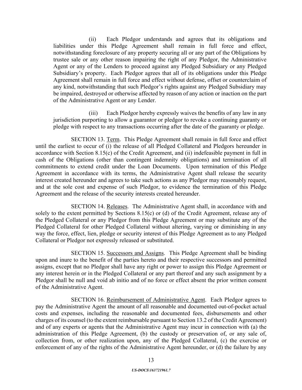 13 US-DOCS\163721961.7 (ii) Each Pledgor understands and agrees that its obligations and liabilities under this Pledge Agreement shall remain in full force and effect, notwithstanding foreclosure of any property securing all or any part of the Obligations by trustee sale or any other reason impairing the right of any Pledgor, the Administrative Agent or any of the Lenders to proceed against any Pledged Subsidiary or any Pledged Subsidiary’s property. Each Pledgor agrees that all of its obligations under this Pledge Agreement shall remain in full force and effect without defense, offset or counterclaim of any kind, notwithstanding that such Pledgor’s rights against any Pledged Subsidiary may be impaired, destroyed or otherwise affected by reason of any action or inaction on the part of the Administrative Agent or any Lender. (iii) Each Pledgor hereby expressly waives the benefits of any law in any jurisdiction purporting to allow a guarantor or pledgor to revoke a continuing guaranty or pledge with respect to any transactions occurring after the date of the guaranty or pledge. SECTION 13. Term. This Pledge Agreement shall remain in full force and effect until the earliest to occur of (i) the release of all Pledged Collateral and Pledgors hereunder in accordance with Section 8.15(c) of the Credit Agreement, and (ii) indefeasible payment in full in cash of the Obligations (other than contingent indemnity obligations) and termination of all commitments to extend credit under the Loan Documents. Upon termination of this Pledge Agreement in accordance with its terms, the Administrative Agent shall release the security interest created hereunder and agrees to take such actions as any Pledgor may reasonably request, and at the sole cost and expense of such Pledgor, to evidence the termination of this Pledge Agreement and the release of the security interests created hereunder. SECTION 14. Releases. The Administrative Agent shall, in accordance with and solely to the extent permitted by Sections 8.15(c) or (d) of the Credit Agreement, release any of the Pledged Collateral or any Pledgor from this Pledge Agreement or may substitute any of the Pledged Collateral for other Pledged Collateral without altering, varying or diminishing in any way the force, effect, lien, pledge or security interest of this Pledge Agreement as to any Pledged Collateral or Pledgor not expressly released or substituted. SECTION 15. Successors and Assigns. This Pledge Agreement shall be binding upon and inure to the benefit of the parties hereto and their respective successors and permitted assigns, except that no Pledgor shall have any right or power to assign this Pledge Agreement or any interest herein or in the Pledged Collateral or any part thereof and any such assignment by a Pledgor shall be null and void ab initio and of no force or effect absent the prior written consent of the Administrative Agent. SECTION 16. Reimbursement of Administrative Agent. Each Pledgor agrees to pay the Administrative Agent the amount of all reasonable and documented out-of-pocket actual costs and expenses, including the reasonable and documented fees, disbursements and other charges of its counsel (to the extent reimbursable pursuant to Section 13.2 of the Credit Agreement) and of any experts or agents that the Administrative Agent may incur in connection with (a) the administration of this Pledge Agreement, (b) the custody or preservation of, or any sale of, collection from, or other realization upon, any of the Pledged Collateral, (c) the exercise or enforcement of any of the rights of the Administrative Agent hereunder, or (d) the failure by any