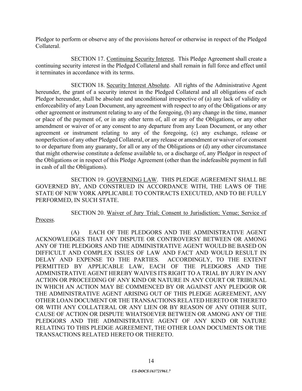 14 US-DOCS\163721961.7 Pledgor to perform or observe any of the provisions hereof or otherwise in respect of the Pledged Collateral. SECTION 17. Continuing Security Interest. This Pledge Agreement shall create a continuing security interest in the Pledged Collateral and shall remain in full force and effect until it terminates in accordance with its terms. SECTION 18. Security Interest Absolute. All rights of the Administrative Agent hereunder, the grant of a security interest in the Pledged Collateral and all obligations of each Pledgor hereunder, shall be absolute and unconditional irrespective of (a) any lack of validity or enforceability of any Loan Document, any agreement with respect to any of the Obligations or any other agreement or instrument relating to any of the foregoing, (b) any change in the time, manner or place of the payment of, or in any other term of, all or any of the Obligations, or any other amendment or waiver of or any consent to any departure from any Loan Document, or any other agreement or instrument relating to any of the foregoing, (c) any exchange, release or nonperfection of any other Pledged Collateral, or any release or amendment or waiver of or consent to or departure from any guaranty, for all or any of the Obligations or (d) any other circumstance that might otherwise constitute a defense available to, or a discharge of, any Pledgor in respect of the Obligations or in respect of this Pledge Agreement (other than the indefeasible payment in full in cash of all the Obligations). SECTION 19. GOVERNING LAW. THIS PLEDGE AGREEMENT SHALL BE GOVERNED BY, AND CONSTRUED IN ACCORDANCE WITH, THE LAWS OF THE STATE OF NEW YORK APPLICABLE TO CONTRACTS EXECUTED, AND TO BE FULLY PERFORMED, IN SUCH STATE. SECTION 20. Waiver of Jury Trial; Consent to Jurisdiction; Venue; Service of Process. (A) EACH OF THE PLEDGORS AND THE ADMINISTRATIVE AGENT ACKNOWLEDGES THAT ANY DISPUTE OR CONTROVERSY BETWEEN OR AMONG ANY OF THE PLEDGORS AND THE ADMINISTRATIVE AGENT WOULD BE BASED ON DIFFICULT AND COMPLEX ISSUES OF LAW AND FACT AND WOULD RESULT IN DELAY AND EXPENSE TO THE PARTIES. ACCORDINGLY, TO THE EXTENT PERMITTED BY APPLICABLE LAW, EACH OF THE PLEDGORS AND THE ADMINISTRATIVE AGENT HEREBY WAIVES ITS RIGHT TO A TRIAL BY JURY IN ANY ACTION OR PROCEEDING OF ANY KIND OR NATURE IN ANY COURT OR TRIBUNAL IN WHICH AN ACTION MAY BE COMMENCED BY OR AGAINST ANY PLEDGOR OR THE ADMINISTRATIVE AGENT ARISING OUT OF THIS PLEDGE AGREEMENT, ANY OTHER LOAN DOCUMENT OR THE TRANSACTIONS RELATED HERETO OR THERETO OR WITH ANY COLLATERAL OR ANY LIEN OR BY REASON OF ANY OTHER SUIT, CAUSE OF ACTION OR DISPUTE WHATSOEVER BETWEEN OR AMONG ANY OF THE PLEDGORS AND THE ADMINISTRATIVE AGENT OF ANY KIND OR NATURE RELATING TO THIS PLEDGE AGREEMENT, THE OTHER LOAN DOCUMENTS OR THE TRANSACTIONS RELATED HERETO OR THERETO.
