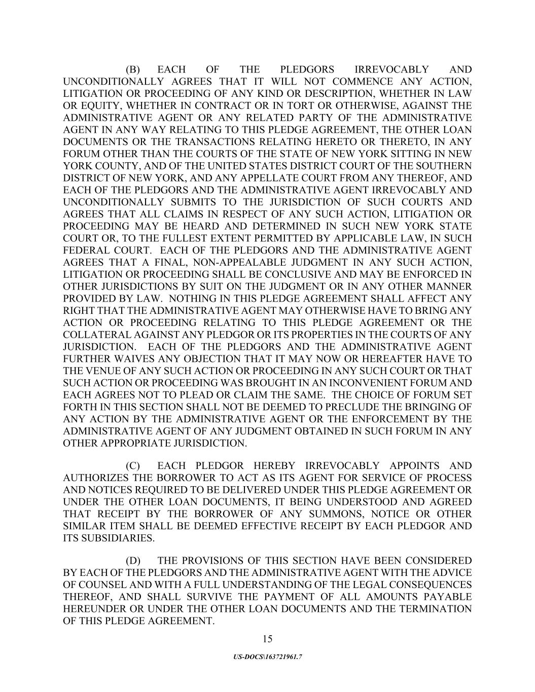 15 US-DOCS\163721961.7 (B) EACH OF THE PLEDGORS IRREVOCABLY AND UNCONDITIONALLY AGREES THAT IT WILL NOT COMMENCE ANY ACTION, LITIGATION OR PROCEEDING OF ANY KIND OR DESCRIPTION, WHETHER IN LAW OR EQUITY, WHETHER IN CONTRACT OR IN TORT OR OTHERWISE, AGAINST THE ADMINISTRATIVE AGENT OR ANY RELATED PARTY OF THE ADMINISTRATIVE AGENT IN ANY WAY RELATING TO THIS PLEDGE AGREEMENT, THE OTHER LOAN DOCUMENTS OR THE TRANSACTIONS RELATING HERETO OR THERETO, IN ANY FORUM OTHER THAN THE COURTS OF THE STATE OF NEW YORK SITTING IN NEW YORK COUNTY, AND OF THE UNITED STATES DISTRICT COURT OF THE SOUTHERN DISTRICT OF NEW YORK, AND ANY APPELLATE COURT FROM ANY THEREOF, AND EACH OF THE PLEDGORS AND THE ADMINISTRATIVE AGENT IRREVOCABLY AND UNCONDITIONALLY SUBMITS TO THE JURISDICTION OF SUCH COURTS AND AGREES THAT ALL CLAIMS IN RESPECT OF ANY SUCH ACTION, LITIGATION OR PROCEEDING MAY BE HEARD AND DETERMINED IN SUCH NEW YORK STATE COURT OR, TO THE FULLEST EXTENT PERMITTED BY APPLICABLE LAW, IN SUCH FEDERAL COURT. EACH OF THE PLEDGORS AND THE ADMINISTRATIVE AGENT AGREES THAT A FINAL, NON-APPEALABLE JUDGMENT IN ANY SUCH ACTION, LITIGATION OR PROCEEDING SHALL BE CONCLUSIVE AND MAY BE ENFORCED IN OTHER JURISDICTIONS BY SUIT ON THE JUDGMENT OR IN ANY OTHER MANNER PROVIDED BY LAW. NOTHING IN THIS PLEDGE AGREEMENT SHALL AFFECT ANY RIGHT THAT THE ADMINISTRATIVE AGENT MAY OTHERWISE HAVE TO BRING ANY ACTION OR PROCEEDING RELATING TO THIS PLEDGE AGREEMENT OR THE COLLATERAL AGAINST ANY PLEDGOR OR ITS PROPERTIES IN THE COURTS OF ANY JURISDICTION. EACH OF THE PLEDGORS AND THE ADMINISTRATIVE AGENT FURTHER WAIVES ANY OBJECTION THAT IT MAY NOW OR HEREAFTER HAVE TO THE VENUE OF ANY SUCH ACTION OR PROCEEDING IN ANY SUCH COURT OR THAT SUCH ACTION OR PROCEEDING WAS BROUGHT IN AN INCONVENIENT FORUM AND EACH AGREES NOT TO PLEAD OR CLAIM THE SAME. THE CHOICE OF FORUM SET FORTH IN THIS SECTION SHALL NOT BE DEEMED TO PRECLUDE THE BRINGING OF ANY ACTION BY THE ADMINISTRATIVE AGENT OR THE ENFORCEMENT BY THE ADMINISTRATIVE AGENT OF ANY JUDGMENT OBTAINED IN SUCH FORUM IN ANY OTHER APPROPRIATE JURISDICTION. (C) EACH PLEDGOR HEREBY IRREVOCABLY APPOINTS AND AUTHORIZES THE BORROWER TO ACT AS ITS AGENT FOR SERVICE OF PROCESS AND NOTICES REQUIRED TO BE DELIVERED UNDER THIS PLEDGE AGREEMENT OR UNDER THE OTHER LOAN DOCUMENTS, IT BEING UNDERSTOOD AND AGREED THAT RECEIPT BY THE BORROWER OF ANY SUMMONS, NOTICE OR OTHER SIMILAR ITEM SHALL BE DEEMED EFFECTIVE RECEIPT BY EACH PLEDGOR AND ITS SUBSIDIARIES. (D) THE PROVISIONS OF THIS SECTION HAVE BEEN CONSIDERED BY EACH OF THE PLEDGORS AND THE ADMINISTRATIVE AGENT WITH THE ADVICE OF COUNSEL AND WITH A FULL UNDERSTANDING OF THE LEGAL CONSEQUENCES THEREOF, AND SHALL SURVIVE THE PAYMENT OF ALL AMOUNTS PAYABLE HEREUNDER OR UNDER THE OTHER LOAN DOCUMENTS AND THE TERMINATION OF THIS PLEDGE AGREEMENT.