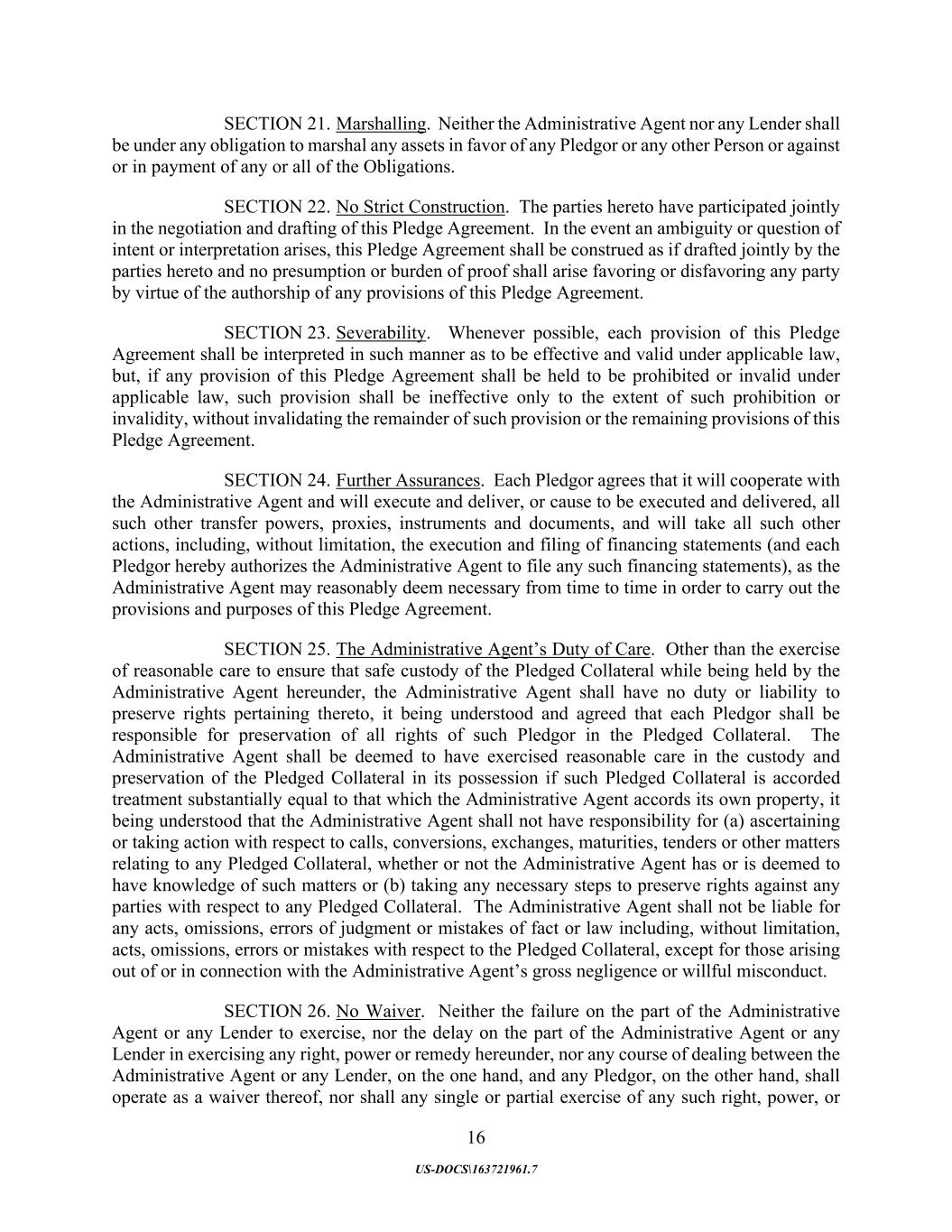 16 US-DOCS\163721961.7 SECTION 21. Marshalling. Neither the Administrative Agent nor any Lender shall be under any obligation to marshal any assets in favor of any Pledgor or any other Person or against or in payment of any or all of the Obligations. SECTION 22. No Strict Construction. The parties hereto have participated jointly in the negotiation and drafting of this Pledge Agreement. In the event an ambiguity or question of intent or interpretation arises, this Pledge Agreement shall be construed as if drafted jointly by the parties hereto and no presumption or burden of proof shall arise favoring or disfavoring any party by virtue of the authorship of any provisions of this Pledge Agreement. SECTION 23. Severability. Whenever possible, each provision of this Pledge Agreement shall be interpreted in such manner as to be effective and valid under applicable law, but, if any provision of this Pledge Agreement shall be held to be prohibited or invalid under applicable law, such provision shall be ineffective only to the extent of such prohibition or invalidity, without invalidating the remainder of such provision or the remaining provisions of this Pledge Agreement. SECTION 24. Further Assurances. Each Pledgor agrees that it will cooperate with the Administrative Agent and will execute and deliver, or cause to be executed and delivered, all such other transfer powers, proxies, instruments and documents, and will take all such other actions, including, without limitation, the execution and filing of financing statements (and each Pledgor hereby authorizes the Administrative Agent to file any such financing statements), as the Administrative Agent may reasonably deem necessary from time to time in order to carry out the provisions and purposes of this Pledge Agreement. SECTION 25. The Administrative Agent’s Duty of Care. Other than the exercise of reasonable care to ensure that safe custody of the Pledged Collateral while being held by the Administrative Agent hereunder, the Administrative Agent shall have no duty or liability to preserve rights pertaining thereto, it being understood and agreed that each Pledgor shall be responsible for preservation of all rights of such Pledgor in the Pledged Collateral. The Administrative Agent shall be deemed to have exercised reasonable care in the custody and preservation of the Pledged Collateral in its possession if such Pledged Collateral is accorded treatment substantially equal to that which the Administrative Agent accords its own property, it being understood that the Administrative Agent shall not have responsibility for (a) ascertaining or taking action with respect to calls, conversions, exchanges, maturities, tenders or other matters relating to any Pledged Collateral, whether or not the Administrative Agent has or is deemed to have knowledge of such matters or (b) taking any necessary steps to preserve rights against any parties with respect to any Pledged Collateral. The Administrative Agent shall not be liable for any acts, omissions, errors of judgment or mistakes of fact or law including, without limitation, acts, omissions, errors or mistakes with respect to the Pledged Collateral, except for those arising out of or in connection with the Administrative Agent’s gross negligence or willful misconduct. SECTION 26. No Waiver. Neither the failure on the part of the Administrative Agent or any Lender to exercise, nor the delay on the part of the Administrative Agent or any Lender in exercising any right, power or remedy hereunder, nor any course of dealing between the Administrative Agent or any Lender, on the one hand, and any Pledgor, on the other hand, shall operate as a waiver thereof, nor shall any single or partial exercise of any such right, power, or