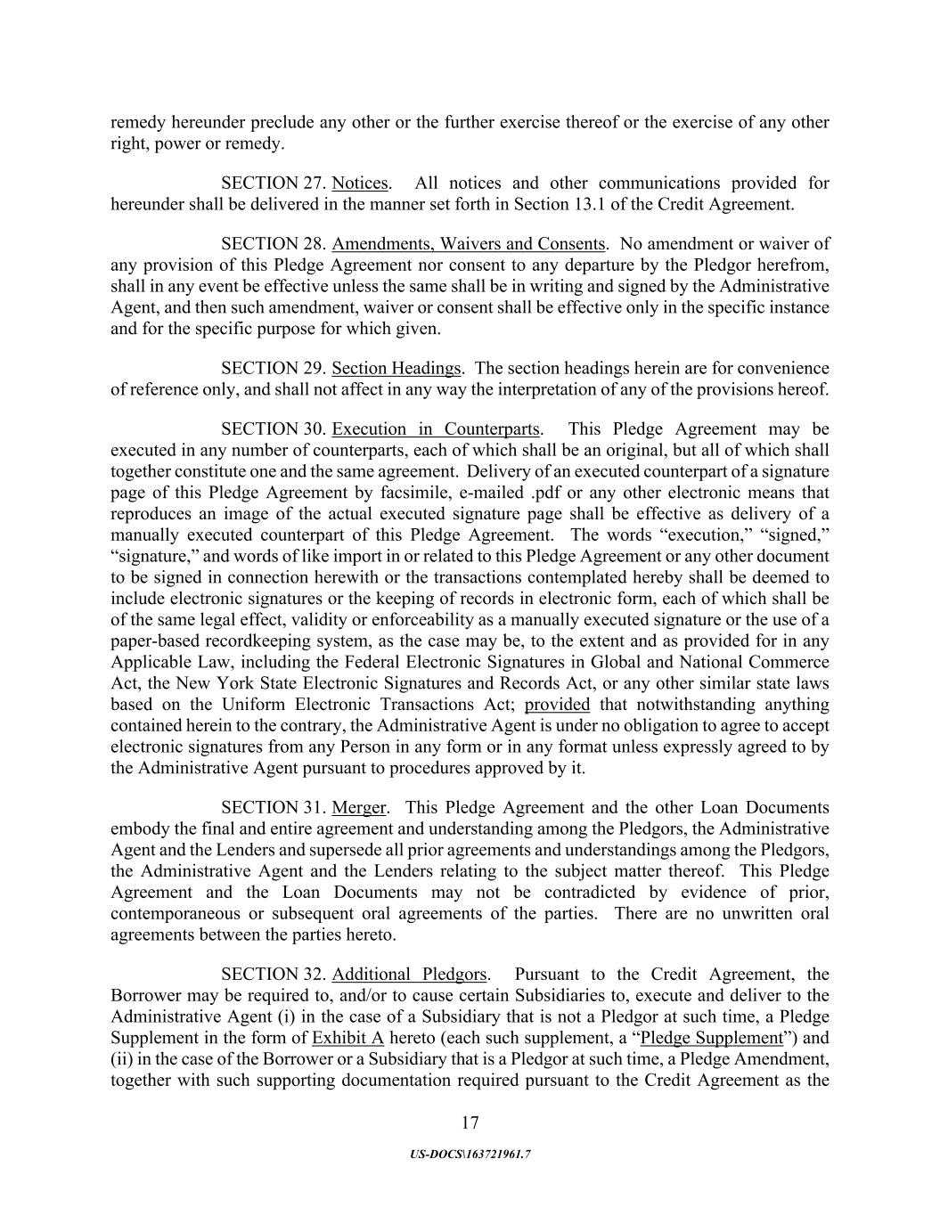 17 US-DOCS\163721961.7 remedy hereunder preclude any other or the further exercise thereof or the exercise of any other right, power or remedy. SECTION 27. Notices. All notices and other communications provided for hereunder shall be delivered in the manner set forth in Section 13.1 of the Credit Agreement. SECTION 28. Amendments, Waivers and Consents. No amendment or waiver of any provision of this Pledge Agreement nor consent to any departure by the Pledgor herefrom, shall in any event be effective unless the same shall be in writing and signed by the Administrative Agent, and then such amendment, waiver or consent shall be effective only in the specific instance and for the specific purpose for which given. SECTION 29. Section Headings. The section headings herein are for convenience of reference only, and shall not affect in any way the interpretation of any of the provisions hereof. SECTION 30. Execution in Counterparts. This Pledge Agreement may be executed in any number of counterparts, each of which shall be an original, but all of which shall together constitute one and the same agreement. Delivery of an executed counterpart of a signature page of this Pledge Agreement by facsimile, e-mailed .pdf or any other electronic means that reproduces an image of the actual executed signature page shall be effective as delivery of a manually executed counterpart of this Pledge Agreement. The words “execution,” “signed,” “signature,” and words of like import in or related to this Pledge Agreement or any other document to be signed in connection herewith or the transactions contemplated hereby shall be deemed to include electronic signatures or the keeping of records in electronic form, each of which shall be of the same legal effect, validity or enforceability as a manually executed signature or the use of a paper-based recordkeeping system, as the case may be, to the extent and as provided for in any Applicable Law, including the Federal Electronic Signatures in Global and National Commerce Act, the New York State Electronic Signatures and Records Act, or any other similar state laws based on the Uniform Electronic Transactions Act; provided that notwithstanding anything contained herein to the contrary, the Administrative Agent is under no obligation to agree to accept electronic signatures from any Person in any form or in any format unless expressly agreed to by the Administrative Agent pursuant to procedures approved by it. SECTION 31. Merger. This Pledge Agreement and the other Loan Documents embody the final and entire agreement and understanding among the Pledgors, the Administrative Agent and the Lenders and supersede all prior agreements and understandings among the Pledgors, the Administrative Agent and the Lenders relating to the subject matter thereof. This Pledge Agreement and the Loan Documents may not be contradicted by evidence of prior, contemporaneous or subsequent oral agreements of the parties. There are no unwritten oral agreements between the parties hereto. SECTION 32. Additional Pledgors. Pursuant to the Credit Agreement, the Borrower may be required to, and/or to cause certain Subsidiaries to, execute and deliver to the Administrative Agent (i) in the case of a Subsidiary that is not a Pledgor at such time, a Pledge Supplement in the form of Exhibit A hereto (each such supplement, a “Pledge Supplement”) and (ii) in the case of the Borrower or a Subsidiary that is a Pledgor at such time, a Pledge Amendment, together with such supporting documentation required pursuant to the Credit Agreement as the