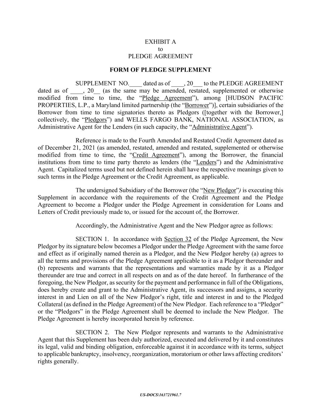 US-DOCS\163721961.7 EXHIBIT A to PLEDGE AGREEMENT FORM OF PLEDGE SUPPLEMENT SUPPLEMENT NO.____ dated as of ____, 20___ to the PLEDGE AGREEMENT dated as of ____, 20__ (as the same may be amended, restated, supplemented or otherwise modified from time to time, the “Pledge Agreement”), among [HUDSON PACIFIC PROPERTIES, L.P., a Maryland limited partnership (the “Borrower”)], certain subsidiaries of the Borrower from time to time signatories thereto as Pledgors ([together with the Borrower,] collectively, the “Pledgors”) and WELLS FARGO BANK, NATIONAL ASSOCIATION, as Administrative Agent for the Lenders (in such capacity, the “Administrative Agent”). Reference is made to the Fourth Amended and Restated Credit Agreement dated as of December 21, 2021 (as amended, restated, amended and restated, supplemented or otherwise modified from time to time, the “Credit Agreement”), among the Borrower, the financial institutions from time to time party thereto as lenders (the “Lenders”) and the Administrative Agent. Capitalized terms used but not defined herein shall have the respective meanings given to such terms in the Pledge Agreement or the Credit Agreement, as applicable. The undersigned Subsidiary of the Borrower (the “New Pledgor”) is executing this Supplement in accordance with the requirements of the Credit Agreement and the Pledge Agreement to become a Pledgor under the Pledge Agreement in consideration for Loans and Letters of Credit previously made to, or issued for the account of, the Borrower. Accordingly, the Administrative Agent and the New Pledgor agree as follows: SECTION 1. In accordance with Section 32 of the Pledge Agreement, the New Pledgor by its signature below becomes a Pledgor under the Pledge Agreement with the same force and effect as if originally named therein as a Pledgor, and the New Pledgor hereby (a) agrees to all the terms and provisions of the Pledge Agreement applicable to it as a Pledgor thereunder and (b) represents and warrants that the representations and warranties made by it as a Pledgor thereunder are true and correct in all respects on and as of the date hereof. In furtherance of the foregoing, the New Pledgor, as security for the payment and performance in full of the Obligations, does hereby create and grant to the Administrative Agent, its successors and assigns, a security interest in and Lien on all of the New Pledgor’s right, title and interest in and to the Pledged Collateral (as defined in the Pledge Agreement) of the New Pledgor. Each reference to a “Pledgor” or the “Pledgors” in the Pledge Agreement shall be deemed to include the New Pledgor. The Pledge Agreement is hereby incorporated herein by reference. SECTION 2. The New Pledgor represents and warrants to the Administrative Agent that this Supplement has been duly authorized, executed and delivered by it and constitutes its legal, valid and binding obligation, enforceable against it in accordance with its terms, subject to applicable bankruptcy, insolvency, reorganization, moratorium or other laws affecting creditors’ rights generally.