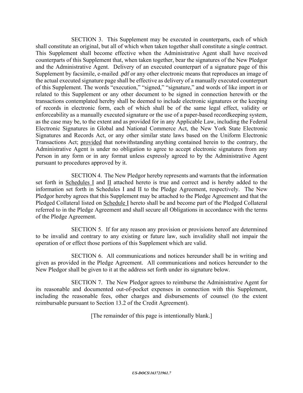 US-DOCS\163721961.7 SECTION 3. This Supplement may be executed in counterparts, each of which shall constitute an original, but all of which when taken together shall constitute a single contract. This Supplement shall become effective when the Administrative Agent shall have received counterparts of this Supplement that, when taken together, bear the signatures of the New Pledgor and the Administrative Agent. Delivery of an executed counterpart of a signature page of this Supplement by facsimile, e-mailed .pdf or any other electronic means that reproduces an image of the actual executed signature page shall be effective as delivery of a manually executed counterpart of this Supplement. The words “execution,” “signed,” “signature,” and words of like import in or related to this Supplement or any other document to be signed in connection herewith or the transactions contemplated hereby shall be deemed to include electronic signatures or the keeping of records in electronic form, each of which shall be of the same legal effect, validity or enforceability as a manually executed signature or the use of a paper-based recordkeeping system, as the case may be, to the extent and as provided for in any Applicable Law, including the Federal Electronic Signatures in Global and National Commerce Act, the New York State Electronic Signatures and Records Act, or any other similar state laws based on the Uniform Electronic Transactions Act; provided that notwithstanding anything contained herein to the contrary, the Administrative Agent is under no obligation to agree to accept electronic signatures from any Person in any form or in any format unless expressly agreed to by the Administrative Agent pursuant to procedures approved by it. SECTION 4. The New Pledgor hereby represents and warrants that the information set forth in Schedules I and II attached hereto is true and correct and is hereby added to the information set forth in Schedules I and II to the Pledge Agreement, respectively. The New Pledgor hereby agrees that this Supplement may be attached to the Pledge Agreement and that the Pledged Collateral listed on Schedule I hereto shall be and become part of the Pledged Collateral referred to in the Pledge Agreement and shall secure all Obligations in accordance with the terms of the Pledge Agreement. SECTION 5. If for any reason any provision or provisions hereof are determined to be invalid and contrary to any existing or future law, such invalidity shall not impair the operation of or effect those portions of this Supplement which are valid. SECTION 6. All communications and notices hereunder shall be in writing and given as provided in the Pledge Agreement. All communications and notices hereunder to the New Pledgor shall be given to it at the address set forth under its signature below. SECTION 7. The New Pledgor agrees to reimburse the Administrative Agent for its reasonable and documented out-of-pocket expenses in connection with this Supplement, including the reasonable fees, other charges and disbursements of counsel (to the extent reimbursable pursuant to Section 13.2 of the Credit Agreement). [The remainder of this page is intentionally blank.]