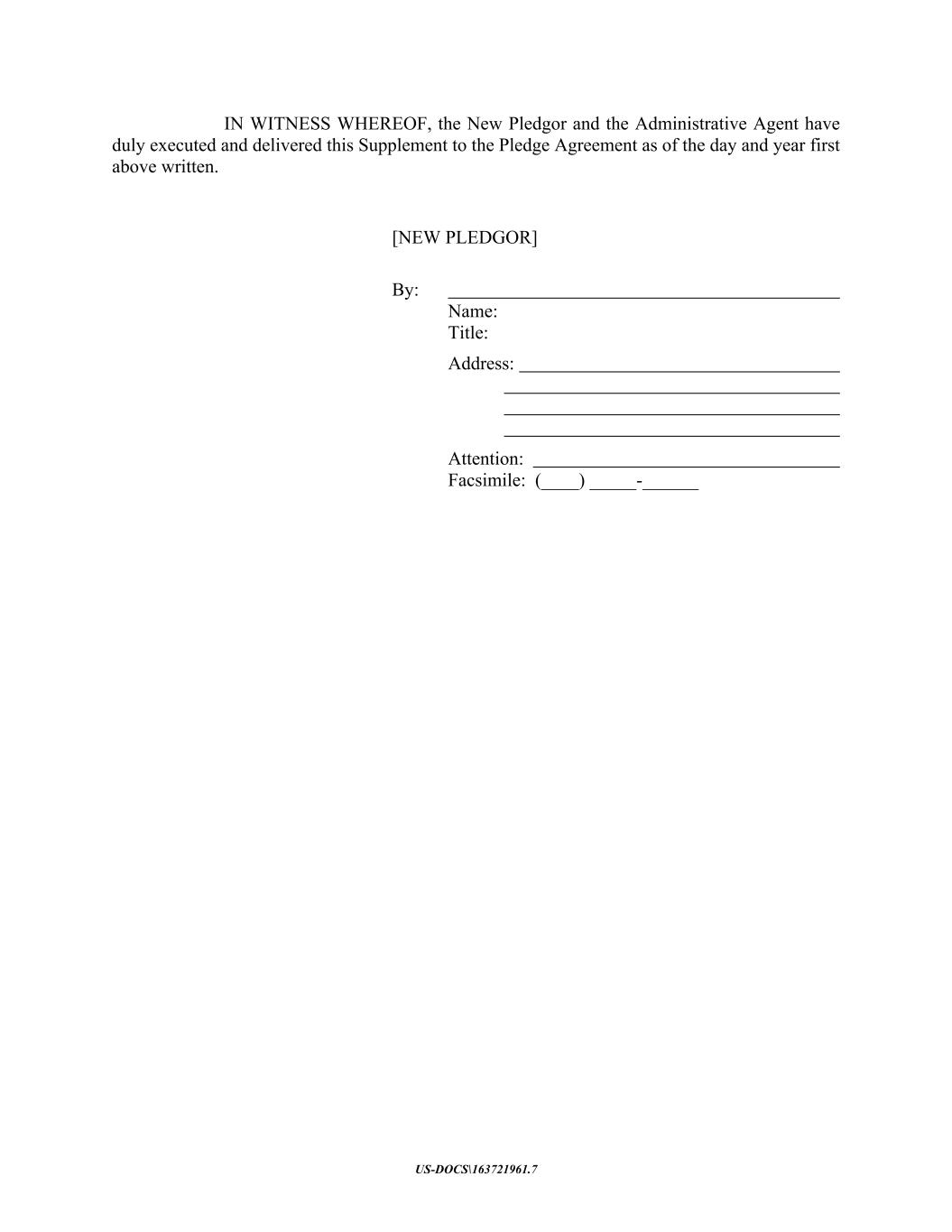 US-DOCS\163721961.7 IN WITNESS WHEREOF, the New Pledgor and the Administrative Agent have duly executed and delivered this Supplement to the Pledge Agreement as of the day and year first above written. [NEW PLEDGOR] By: Name: Title: Address: Attention: Facsimile: (____) _____-______