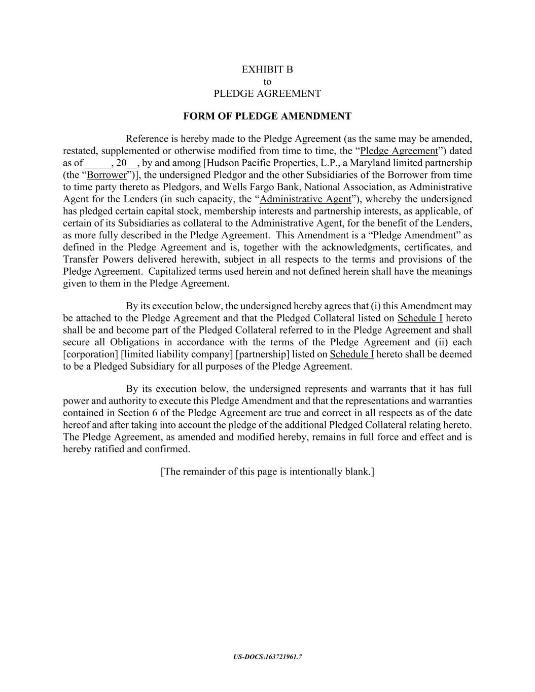 US-DOCS\163721961.7 EXHIBIT B to PLEDGE AGREEMENT FORM OF PLEDGE AMENDMENT Reference is hereby made to the Pledge Agreement (as the same may be amended, restated, supplemented or otherwise modified from time to time, the “Pledge Agreement”) dated as of _____, 20__, by and among [Hudson Pacific Properties, L.P., a Maryland limited partnership (the “Borrower”)], the undersigned Pledgor and the other Subsidiaries of the Borrower from time to time party thereto as Pledgors, and Wells Fargo Bank, National Association, as Administrative Agent for the Lenders (in such capacity, the “Administrative Agent”), whereby the undersigned has pledged certain capital stock, membership interests and partnership interests, as applicable, of certain of its Subsidiaries as collateral to the Administrative Agent, for the benefit of the Lenders, as more fully described in the Pledge Agreement. This Amendment is a “Pledge Amendment” as defined in the Pledge Agreement and is, together with the acknowledgments, certificates, and Transfer Powers delivered herewith, subject in all respects to the terms and provisions of the Pledge Agreement. Capitalized terms used herein and not defined herein shall have the meanings given to them in the Pledge Agreement. By its execution below, the undersigned hereby agrees that (i) this Amendment may be attached to the Pledge Agreement and that the Pledged Collateral listed on Schedule I hereto shall be and become part of the Pledged Collateral referred to in the Pledge Agreement and shall secure all Obligations in accordance with the terms of the Pledge Agreement and (ii) each [corporation] [limited liability company] [partnership] listed on Schedule I hereto shall be deemed to be a Pledged Subsidiary for all purposes of the Pledge Agreement. By its execution below, the undersigned represents and warrants that it has full power and authority to execute this Pledge Amendment and that the representations and warranties contained in Section 6 of the Pledge Agreement are true and correct in all respects as of the date hereof and after taking into account the pledge of the additional Pledged Collateral relating hereto. The Pledge Agreement, as amended and modified hereby, remains in full force and effect and is hereby ratified and confirmed. [The remainder of this page is intentionally blank.]