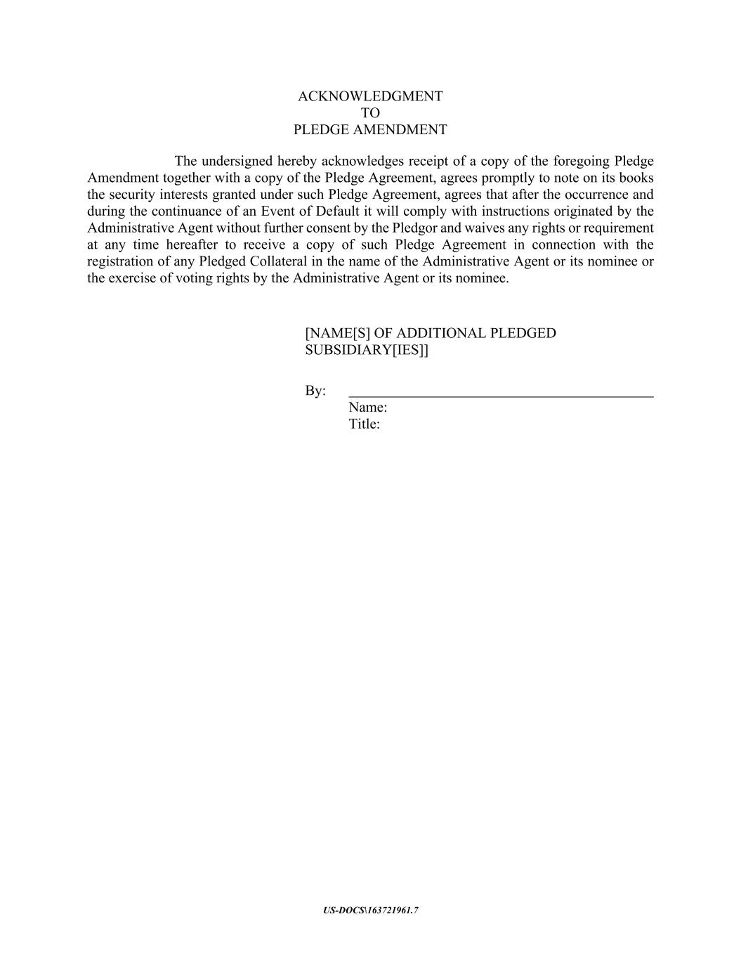 US-DOCS\163721961.7 ACKNOWLEDGMENT TO PLEDGE AMENDMENT The undersigned hereby acknowledges receipt of a copy of the foregoing Pledge Amendment together with a copy of the Pledge Agreement, agrees promptly to note on its books the security interests granted under such Pledge Agreement, agrees that after the occurrence and during the continuance of an Event of Default it will comply with instructions originated by the Administrative Agent without further consent by the Pledgor and waives any rights or requirement at any time hereafter to receive a copy of such Pledge Agreement in connection with the registration of any Pledged Collateral in the name of the Administrative Agent or its nominee or the exercise of voting rights by the Administrative Agent or its nominee. [NAME[S] OF ADDITIONAL PLEDGED SUBSIDIARY[IES]] By: Name: Title: