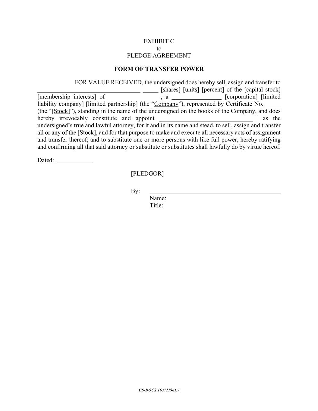 US-DOCS\163721961.7 EXHIBIT C to PLEDGE AGREEMENT FORM OF TRANSFER POWER FOR VALUE RECEIVED, the undersigned does hereby sell, assign and transfer to _________________________________ _____ [shares] [units] [percent] of the [capital stock] [membership interests] of _________________, a _____________ [corporation] [limited liability company] [limited partnership] (the “Company”), represented by Certificate No. _____ (the “[Stock]”), standing in the name of the undersigned on the books of the Company, and does hereby irrevocably constitute and appoint ______________________________ as the undersigned’s true and lawful attorney, for it and in its name and stead, to sell, assign and transfer all or any of the [Stock], and for that purpose to make and execute all necessary acts of assignment and transfer thereof; and to substitute one or more persons with like full power, hereby ratifying and confirming all that said attorney or substitute or substitutes shall lawfully do by virtue hereof. Dated: [PLEDGOR] By: Name: Title: