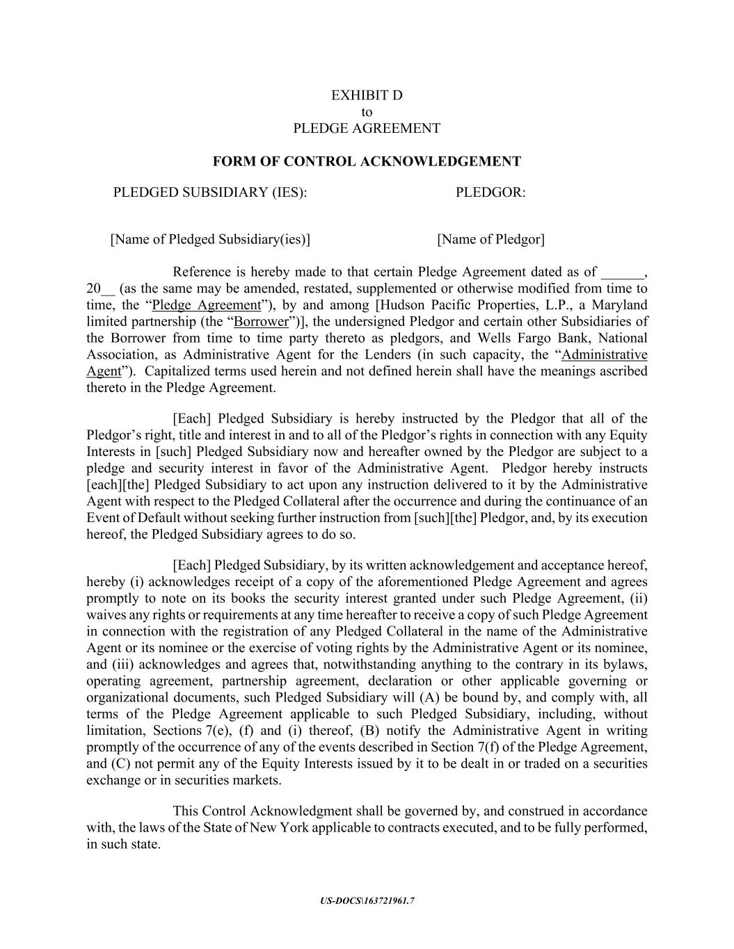 US-DOCS\163721961.7 EXHIBIT D to PLEDGE AGREEMENT FORM OF CONTROL ACKNOWLEDGEMENT PLEDGED SUBSIDIARY (IES): PLEDGOR: [Name of Pledged Subsidiary(ies)] [Name of Pledgor] Reference is hereby made to that certain Pledge Agreement dated as of ______, 20__ (as the same may be amended, restated, supplemented or otherwise modified from time to time, the “Pledge Agreement”), by and among [Hudson Pacific Properties, L.P., a Maryland limited partnership (the “Borrower”)], the undersigned Pledgor and certain other Subsidiaries of the Borrower from time to time party thereto as pledgors, and Wells Fargo Bank, National Association, as Administrative Agent for the Lenders (in such capacity, the “Administrative Agent”). Capitalized terms used herein and not defined herein shall have the meanings ascribed thereto in the Pledge Agreement. [Each] Pledged Subsidiary is hereby instructed by the Pledgor that all of the Pledgor’s right, title and interest in and to all of the Pledgor’s rights in connection with any Equity Interests in [such] Pledged Subsidiary now and hereafter owned by the Pledgor are subject to a pledge and security interest in favor of the Administrative Agent. Pledgor hereby instructs [each][the] Pledged Subsidiary to act upon any instruction delivered to it by the Administrative Agent with respect to the Pledged Collateral after the occurrence and during the continuance of an Event of Default without seeking further instruction from [such][the] Pledgor, and, by its execution hereof, the Pledged Subsidiary agrees to do so. [Each] Pledged Subsidiary, by its written acknowledgement and acceptance hereof, hereby (i) acknowledges receipt of a copy of the aforementioned Pledge Agreement and agrees promptly to note on its books the security interest granted under such Pledge Agreement, (ii) waives any rights or requirements at any time hereafter to receive a copy of such Pledge Agreement in connection with the registration of any Pledged Collateral in the name of the Administrative Agent or its nominee or the exercise of voting rights by the Administrative Agent or its nominee, and (iii) acknowledges and agrees that, notwithstanding anything to the contrary in its bylaws, operating agreement, partnership agreement, declaration or other applicable governing or organizational documents, such Pledged Subsidiary will (A) be bound by, and comply with, all terms of the Pledge Agreement applicable to such Pledged Subsidiary, including, without limitation, Sections 7(e), (f) and (i) thereof, (B) notify the Administrative Agent in writing promptly of the occurrence of any of the events described in Section 7(f) of the Pledge Agreement, and (C) not permit any of the Equity Interests issued by it to be dealt in or traded on a securities exchange or in securities markets. This Control Acknowledgment shall be governed by, and construed in accordance with, the laws of the State of New York applicable to contracts executed, and to be fully performed, in such state.