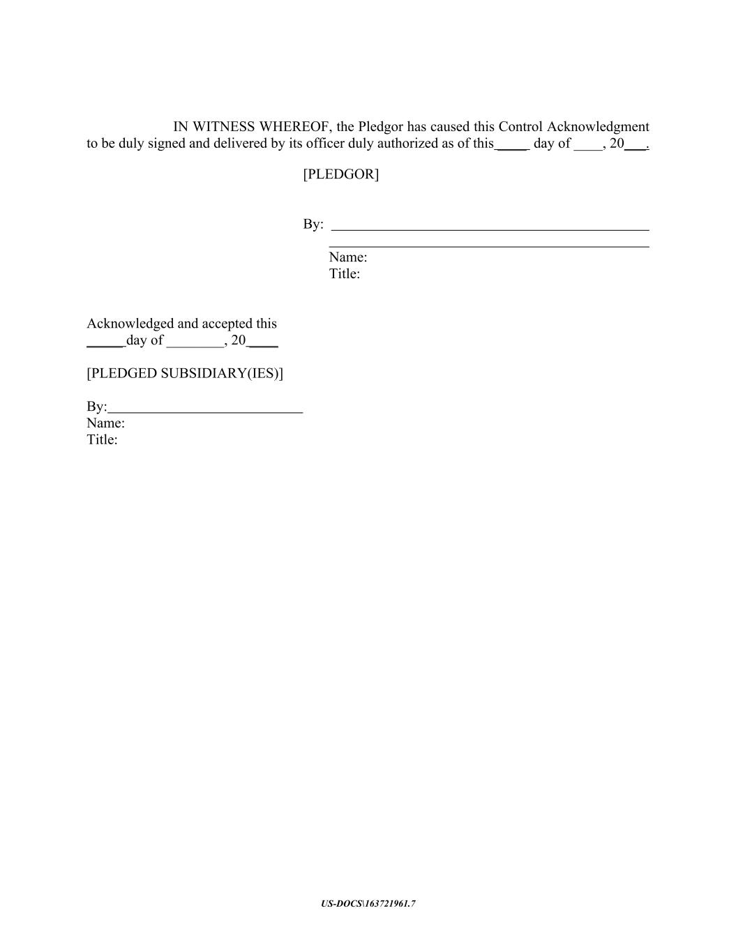 US-DOCS\163721961.7 IN WITNESS WHEREOF, the Pledgor has caused this Control Acknowledgment to be duly signed and delivered by its officer duly authorized as of this ____ day of ____, 20___. [PLEDGOR] By: Name: Title: Acknowledged and accepted this _____ day of ________, 20 ____ [PLEDGED SUBSIDIARY(IES)] By: Name: Title: