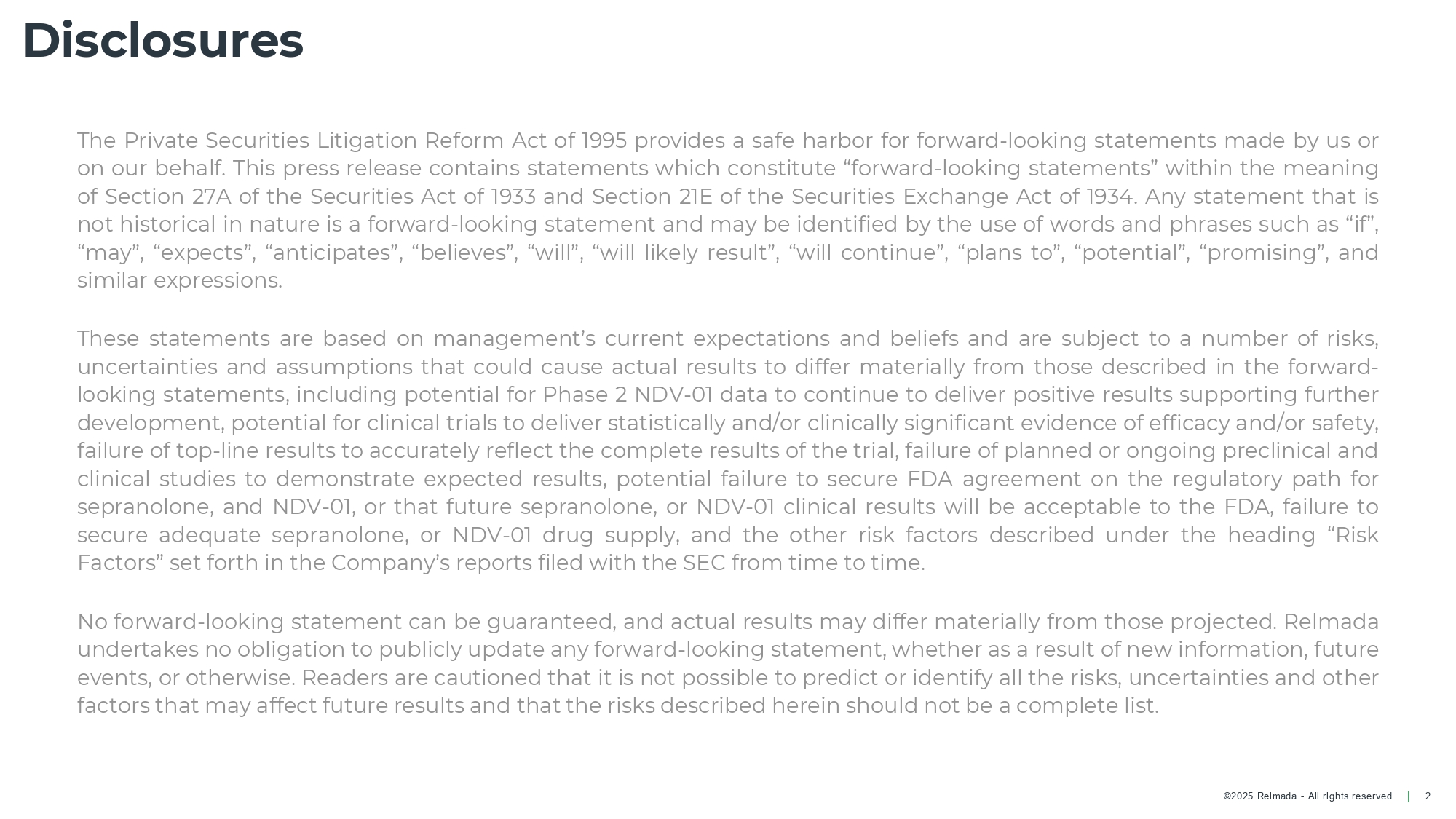 ©2025 Relmada - All rights reserved Disclosures 2 The Private Securities Litigation Reform Act of 1995 provides a safe harbor for forward - looking statements made by us or on our behalf . This press release contains statements which constitute “forward - looking statements” within the meaning of Section 27 A of the Securities Act of 1933 and Section 21 E of the Securities Exchange Act of 1934 . Any statement that is not historical in nature is a forward - looking statement and may be identified by the use of words and phrases such as “if”, “may”, “expects”, “anticipates”, “believes”, “will”, “will likely result”, “will continue”, “plans to”, “potential”, “promising”, and similar expressions . These statements are based on management’s current expectations and beliefs and are subject to a number of risks, uncertainties and assumptions that could cause actual results to differ materially from those described in the forward - looking statements, including potential for Phase 2 NDV - 01 data to continue to deliver positive results supporting further development, potential for clinical trials to deliver statistically and/or clinically significant evidence of efficacy and/or safety, failure of top - line results to accurately reflect the complete results of the trial, failure of planned or ongoing preclinical and clinical studies to demonstrate expected results, potential failure to secure FDA agreement on the regulatory path for sepranolone, and NDV - 01 , or that future sepranolone, or NDV - 01 clinical results will be acceptable to the FDA, failure to secure adequate sepranolone, or NDV - 01 drug supply, and the other risk factors described under the heading “Risk Factors” set forth in the Company’s reports filed with the SEC from time to time . No forward - looking statement can be guaranteed, and actual results may differ materially from those projected . Relmada undertakes no obligation to publicly update any forward - looking statement, whether as a result of new information, future events, or otherwise . Readers are cautioned that it is not possible to predict or identify all the risks, uncertainties and other factors that may affect future results and that the risks described herein should not be a complete list .