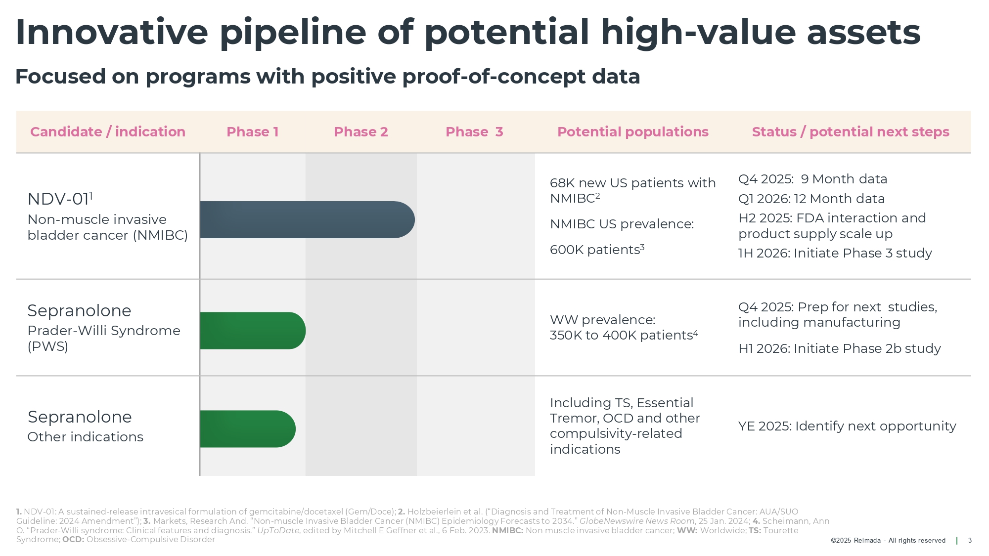 ©2025 Relmada - All rights reserved Innovative pipeline of potential high - value assets 3 Focused on programs with positive proof - of - concept data Status / potential next steps Potential populations Phase 3 Phase 2 Phase 1 Candidate / indication Q4 2025: 9 Month data Q1 2026: 12 Month data H2 2025: FDA interaction and product supply scale up 1H 2026: Initiate Phase 3 study 68K new US patients with NMIBC 2 NMIBC US prevalence: 600K patients 3 NDV - 01 1 Non - muscle invasive bladder cancer (NMIBC) Q4 2025: Prep for next studies, including manufacturing H1 2026: Initiate Phase 2b study WW prevalence: 350K to 400K patients 4 Sepranolone Prader - Willi Syndrome (PWS) YE 2025: Identify next opportunity Including TS, Essential Tremor, OCD and other compulsivity - related indications Sepranolone Other indications 1. NDV - 01: A sustained - release intravesical formulation of gemcitabine/docetaxel (Gem/Doce); 2. Holzbeierlein et al. (“Diagnosis and Treatment of Non - Muscle Invasive Bladder Cancer: AUA/SUO Guideline: 2024 Amendment”); 3. Markets, Research And. “Non - muscle Invasive Bladder Cancer (NMIBC) Epidemiology Forecasts to 2034.” GlobeNewswire News Room , 25 Jan. 2024; 4. Scheimann, Ann O. “Prader - Willi syndrome: Clinical features and diagnosis.” UpToDate , edited by Mitchell E Geffner et al., 6 Feb. 2023. NMIBC: Non muscle invasive bladder cancer; WW: Worldwide; TS: Tourette Syndrome; OCD: Obsessive - Compulsive Disorder