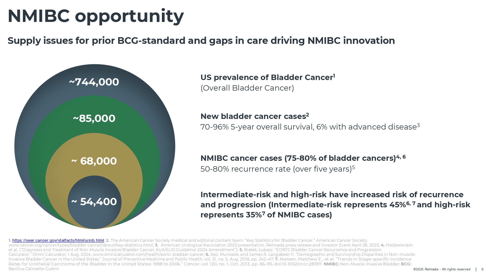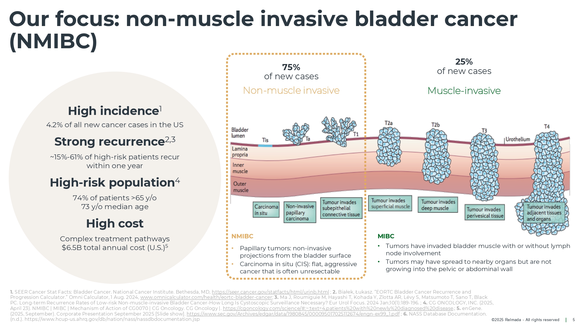 ©2025 Relmada - All rights reserved Our focus: non - muscle invasive bladder cancer (NMIBC) 5 25% of new cases Muscle - invasive 75% of new cases Non - muscle invasive 1. SEER Cancer Stat Facts: Bladder Cancer. National Cancer Institute. Bethesda, MD, https://seer.cancer.gov/statfacts/html/urinb.htm l ; 2. Białek, Łukasz. “EORTC Bladder Cancer Recurrence and Progression Calculator.” Omni Calculator, 1 Aug. 2024, www.omnicalculator.com/health/eortc - bladder - cancer ; 3. Ma J, Roumiguie M, Hayashi T, Kohada Y, Zlotta AR, Lévy S, Matsumoto T, Sano T, Black PC. Long - term Recurrence Rates of Low - risk Non - muscle - invasive Bladder Cancer - How Long Is Cystoscopic Surveillance Necessary? Eur Urol Focus. 2024 Jan;10(1):189 - 196. ; 4. CG ONCOLOGY, INC. (2025, April 23). NMIBC | MIBC | Mechanism of Action of CG0070 | CG Oncology. CG Oncology |. https://cgoncology.com/science/#:~:text=4,patients%20with%20newly%20diagnosed%20disease .; 5. enGene. (2025, September). Corporate Presentation September 2025 [Slide show]. https://www.sec.gov/Archives/edgar/data/1980845/000095017025112674/engn - ex99_1.pdf ; 6. NASS Database Documentation. (n.d.). https:// www.hcup - us.ahrq.gov/db/nation/nass/nassdbdocumentation.jsp High incidence 1 4.2% of all new cancer cases in the US Strong recurrence 2,3 ~15% - 61% of high - risk patients recur within one year High - risk population 4 74% of patients >65 y/o 73 y/o median age High cost Complex treatment pathways $6.5B total annual cost (U.S.) 5 NMIBC • Papillary tumors: non - invasive projections from the bladder surface • Carcinoma in situ (CIS): flat, aggressive cancer that is often unresectable MIBC • Tumors have invaded bladder muscle with or without lymph node involvement • Tumors may have spread to nearby organs but are not growing into the pelvic or abdominal wall