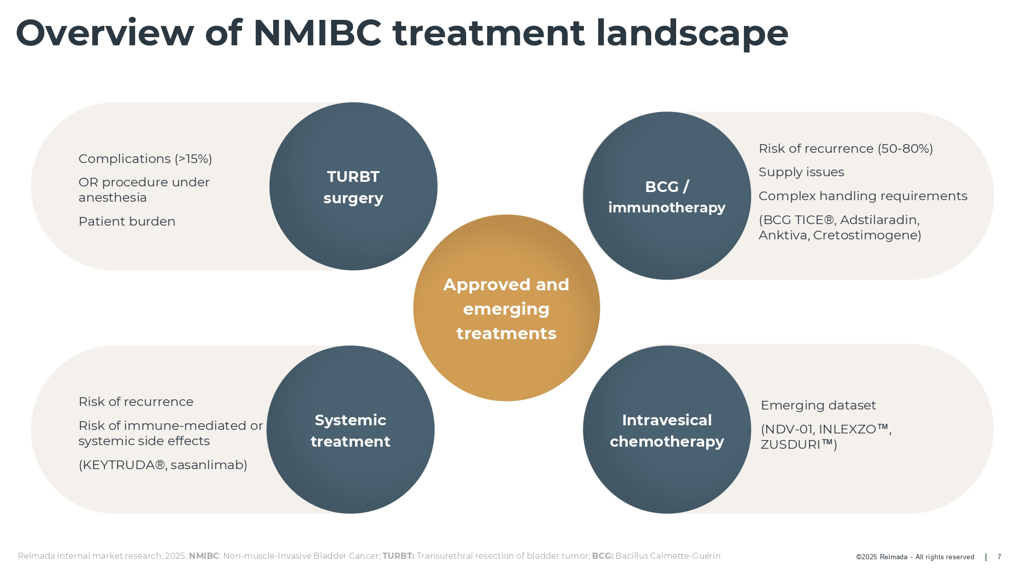 ©2025 Relmada - All rights reserved NMIBC opportunity 1 6 Supply issues for prior BCG - standard and gaps in care driving NMIBC innovation New bladder cancer cases 2 70 - 96% 5 - year overall survival, 6% with advanced disease 3 NMIBC cancer cases (75 - 80% of bladder cancers) 4, 6 50 - 80% recurrence rate (over five years) 5 US prevalence of Bladder Cancer 1 (Overall Bladder Cancer) Intermediate - risk and high - risk have increased risk of recurrence and progression (Intermediate - risk represents 45% 6, 7 and high - risk represents 35% 7 of NMIBC cases) ~ 68,000 ~85,000 ~744,000 ~ 54,400 1. Bladder Cancer | Cancer Types | AACR . (2025, May 19). American Association for Cancer Research (AACR). https:// www.aacr.org/patients - caregivers/cancer/bladder - cancer/#:~:text=Bladder%20cancer%20is%20one%20of,with%20this%20type%20of%20cancer ; 2. The American Cancer Society medical and editorial content team. “Key Statistics for Bladder Cancer.” American Cancer Society, www.cancer.org/cancer/types/bladder - cancer/about/key - statistics.html; 3. American Urological Association 2025 presentation. Relmada press release and Investor Event April 28, 2025; 4. Holzbeierlein et al. (“Diagnosis and Treatment of Non - Muscle Invasive Bladder Cancer: AUA/SUO Guideline: 2024 Amendment”); 5. Białek, Łukasz. “EORTC Bladder Cancer Recurrence and Progression Calculator.” Omni Calculator, 1 Aug. 2024, www.omnicalculator.com/health/eortc - bladder - cancer; 6. Seo, Munseok, and James R. Langabeer II. “Demographic and Survivorship Disparities in Non – muscle - invasive Bladder Cancer in the United States.” Journal of Preventive Medicine and Public Health, vol. 51, no. 5, Aug. 2018, pp. 242 – 47; 7. Nielsen, Matthew E., et al. “Trends in Stage-specific Incidence Rates for Urothelial Carcinoma of the Bladder in the United States: 1988 to 2006.” Cancer , vol. 120, no. 1, Oct. 2013, pp. 86 – 95, doi:10.1002/cncr.28397. NMIBC: Non - Muscle Invasive Bladder; BCG: Bacillus Calmette - Guérin