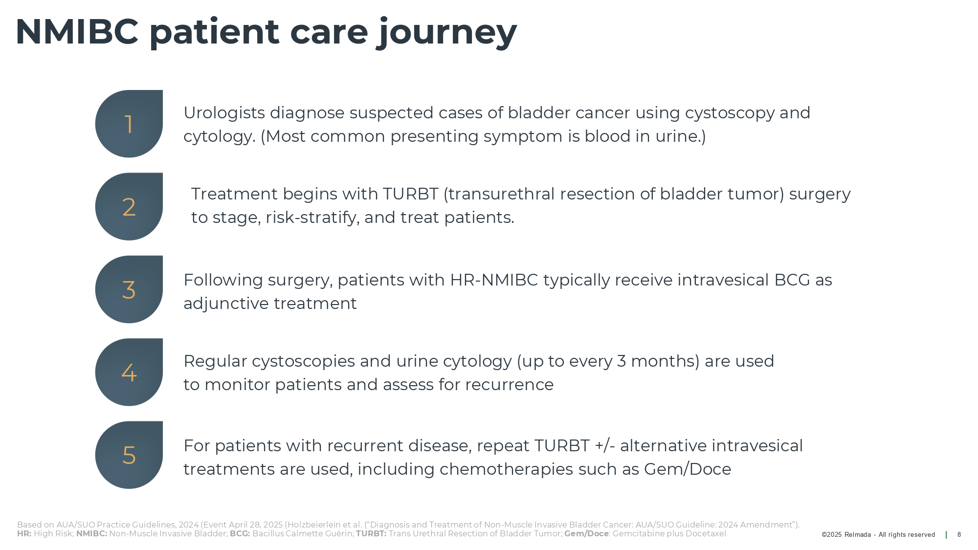 ©2025 Relmada - All rights reserved NMIBC patient care journey 8 Treatment begins with TURBT (transurethral resection of bladder tumor) surgery to stage, risk - stratify, and treat patients. Following surgery, patients with HR - NMIBC typically receive intravesical BCG as adjunctive treatment Physicians diagnose suspected cases of bladder cancer using cystoscopy and cytology. (Most common presenting symptom is blood in urine.) For patients with recurrent disease, repeat TURBT +/ - alternative intravesical treatments are used, including chemotherapies such as Gem/Doce Regular cystoscopies and urine cytology (up to every 3 months) are used to monitor patients and assess for recurrence 1 2 3 4 5 Based on AUA/SUO Practice Guidelines, 2024 (Event April 28, 2025 (Holzbeierlein et al. (“Diagnosis and Treatment of Non - Muscle Invasive Bladder Cancer: AUA/SUO Guideline: 2024 Amendment”). HR: High Risk; NMIBC: Non - Muscle Invasive Bladder; BCG: Bacillus Calmette Guérin; TURBT: Trans Urethral Resection of Bladder Tumor; Gem/Doce : Gemcitabine plus Docetaxel