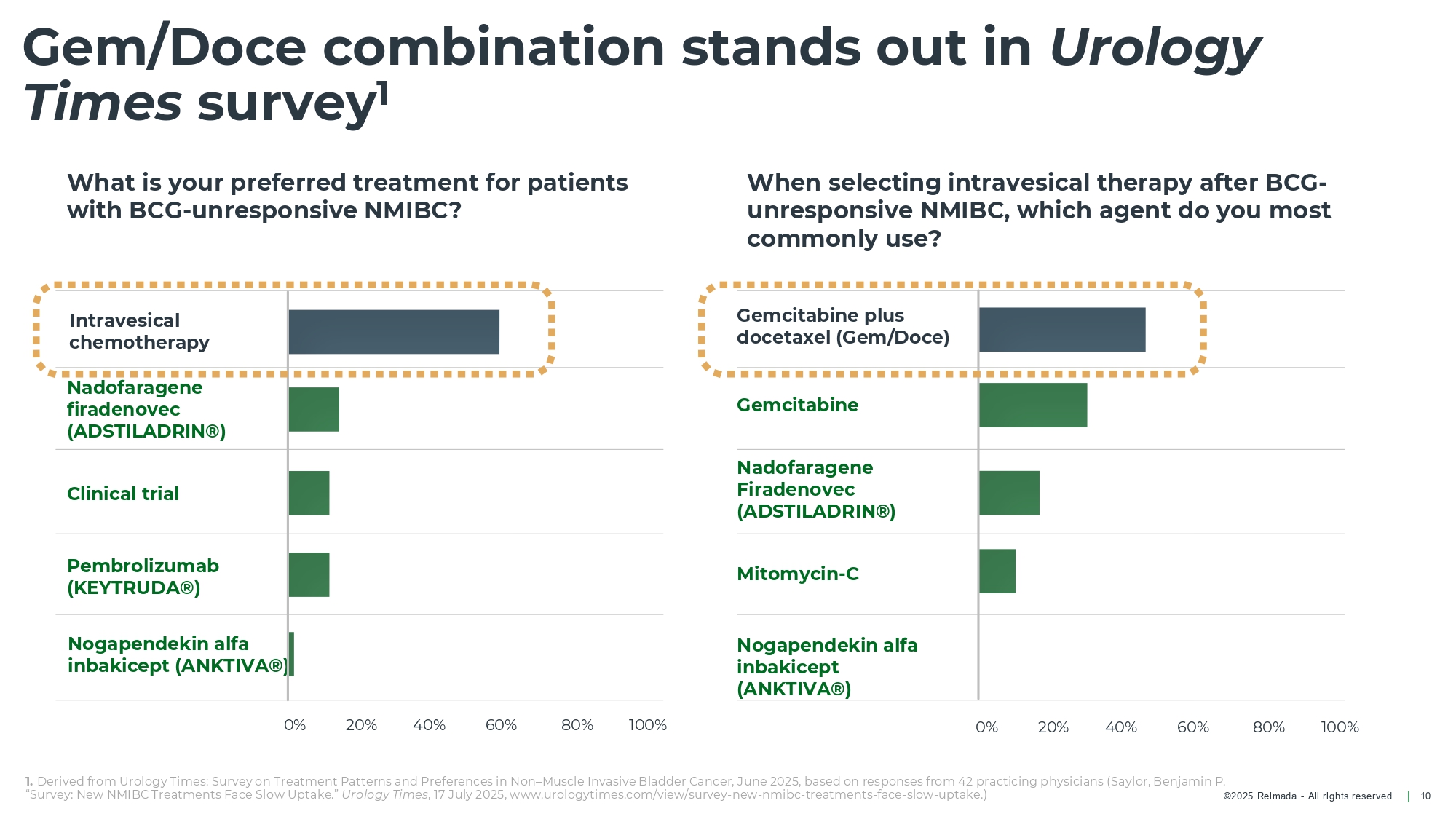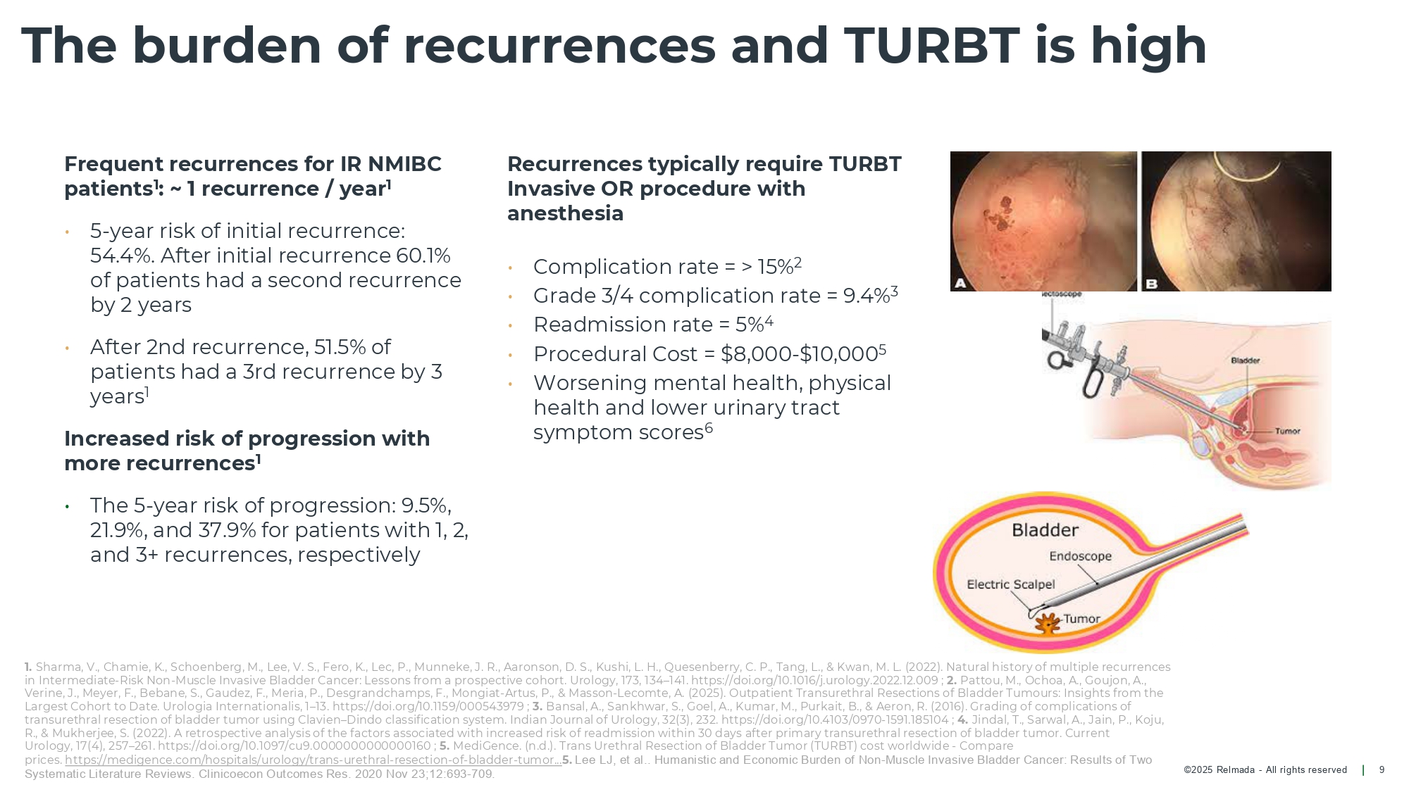©2025 Relmada - All rights reserved The burden of recurrences and TURBT is high 9 Recurrence frequency for IR NMIBC patients 1 : ~ 1/ year 1 • 5 - year risk of initial recurrence: 54.4%. After initial recurrence (n=137), 60.1% of patients had a second recurrence by 2 years • After 2nd recurrence (n=70), 51.5% of patients had a 3rd recurrence by 3 years 1 Increased risk of progression with more recurrences 1 • The 5 - year risk of progression: 9.5%, 21.9%, and 37.9% for patients with 1, 2, and 3+ recurrences, respectively Recurrences typically require TURBT Invasive OR procedure with anesthesia • Complication rate = > 15% 2 • Grade 3/4 complication rate = 9.4% 3 • Readmission rate = 5% 4 • Procedural Cost = $8,000 - $10,000 5 • Worsening mental health, physical health and lower urinary tract symptom scores 1. Sharma, V., Chamie, K., Schoenberg, M., Lee, V. S., Fero, K., Lec, P., Munneke, J. R., Aaronson, D. S., Kushi, L. H., Quesenberry, C. P., Tang, L., & Kwan, M. L. (2022). Natural history of multiple recurrences in Intermediate - Risk Non - Muscle Invasive Bladder Cancer: Lessons from a prospective cohort. Urology, 173, 134 – 141. https://doi.org/10.1016/j.urology.2022.12.009 ; 2. Pattou, M., Ochoa, A., Goujon, A., Verine, J., Meyer, F., Bebane, S., Gaudez, F., Meria, P., Desgrandchamps, F., Mongiat - Artus, P., & Masson - Lecomte, A. (2025). Outpatient Transurethral Resections of Bladder Tumours: Insights from the Largest Cohort to Date. Urologia Internationalis, 1 – 13. https://doi.org/10.1159/000543979 ; 3. Bansal, A., Sankhwar, S., Goel, A., Kumar, M., Purkait, B., & Aeron, R. (2016). Grading of complications of transurethral resection of bladder tumor using Clavien – Dindo classification system. Indian Journal of Urology, 32(3), 232. https://doi.org/10.4103/0970 - 1591.185104 ; 4. Jindal, T., Sarwal, A., Jain, P., Koju, R., & Mukherjee, S. (2022). A retrospective analysis of the factors associated with increased risk of readmission within 30 days after primary transurethral resection of bladder tumor. Current Urology, 17(4), 257 – 261. https://doi.org/10.1097/cu9.0000000000000160 ; 5. MediGence. (n.d.). Trans Urethral Resection of Bladder Tumor (TURBT) cost worldwide - Compare prices. https://medigence.com/hospitals/urology/trans - urethra l - resection - of - bladder - tumor...
