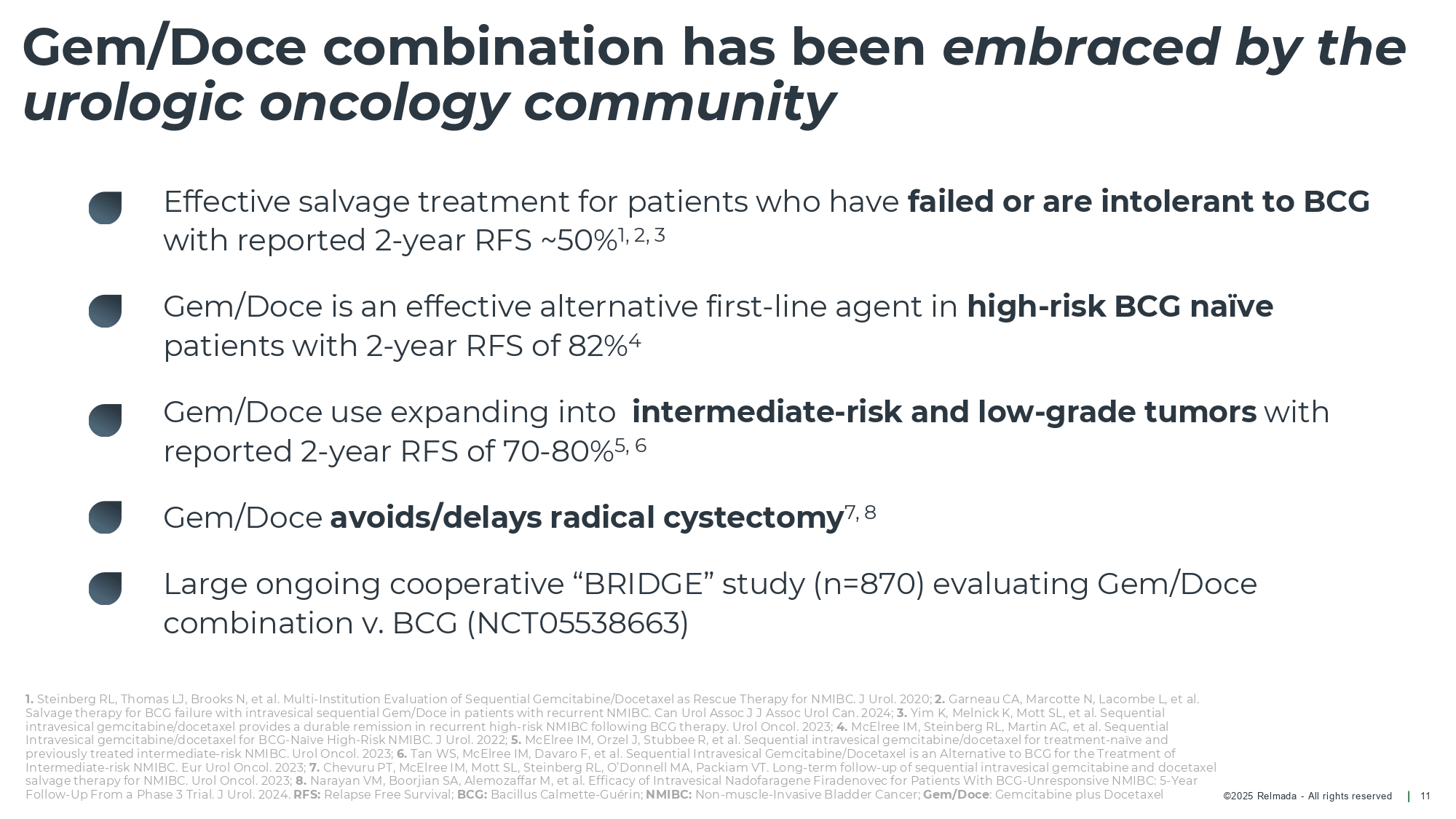 ©2025 Relmada - All rights reserved Gem/Doce combination has been embraced by the urologic oncology community 11 Effective salvage treatment for patients who have failed or are intolerant to BCG with reported 2 - year RFS ~50% 1, 2, 3 Gem/Doce is an effective alternative first - line agent in high - risk BCG naïve patients with 2 - year RFS of 82% 4 Gem/Doce use expanding into intermediate - risk and low - grade tumors with reported 2 - year RFS of 70 - 80% 5, 6 Gem/Doce avoids/delays radical cystectomy 7, 8 Large ongoing cooperative “BRIDGE” study (n=870) evaluating Gem/Doce combination v. BCG (NCT05538663) 1. Steinberg RL, Thomas LJ, Brooks N, et al. Multi - Institution Evaluation of Sequential Gemcitabine/Docetaxel as Rescue Therapy for NMIBC. J Urol. 2020; 2. Garneau CA, Marcotte N, Lacombe L, et al. Salvage therapy for BCG failure with intravesical sequential Gem/Doce in patients with recurrent NMIBC. Can Urol Assoc J J Assoc Urol Can. 2024; 3. Yim K, Melnick K, Mott SL, et al. Sequential intravesical gemcitabine/docetaxel provides a durable remission in recurrent high - risk NMIBC following BCG therapy. Urol Oncol. 2023; 4. McElree IM, Steinberg RL, Martin AC, et al. Sequential Intravesical gemcitabine/docetaxel for BCG - Naïve High - Risk NMIBC. J Urol. 2022; 5. McElree IM, Orzel J, Stubbee R, et al. Sequential intravesical gemcitabine/docetaxel for treatment - naïve and previously treated intermediate - risk NMIBC. Urol Oncol. 2023; 6. Tan WS, McElree IM, Davaro F, et al. Sequential Intravesical Gemcitabine/Docetaxel is an Alternative to BCG for the Treatment of Intermediate - risk NMIBC. Eur Urol Oncol. 2023; 7. Chevuru PT, McElree IM, Mott SL, Steinberg RL, O’Donnell MA, Packiam VT. Long - term follow - up of sequential intravesical gemcitabine and docetaxel salvage therapy for NMIBC. Urol Oncol. 2023; 8. Narayan VM, Boorjian SA, Alemozaffar M, et al. Efficacy of Intravesical Nadofaragene Firadenovec for Patients With BCG - Unresponsive NMIBC: 5 - Year Follow - Up From a Phase 3 Trial. J Urol. 2024. RFS: Relapse Free Survival; BCG: Bacillus Calmette - Guérin; NMIBC: Non - muscle - Invasive Bladder Cancer; Gem/Doce : Gemcitabine plus Docetaxel