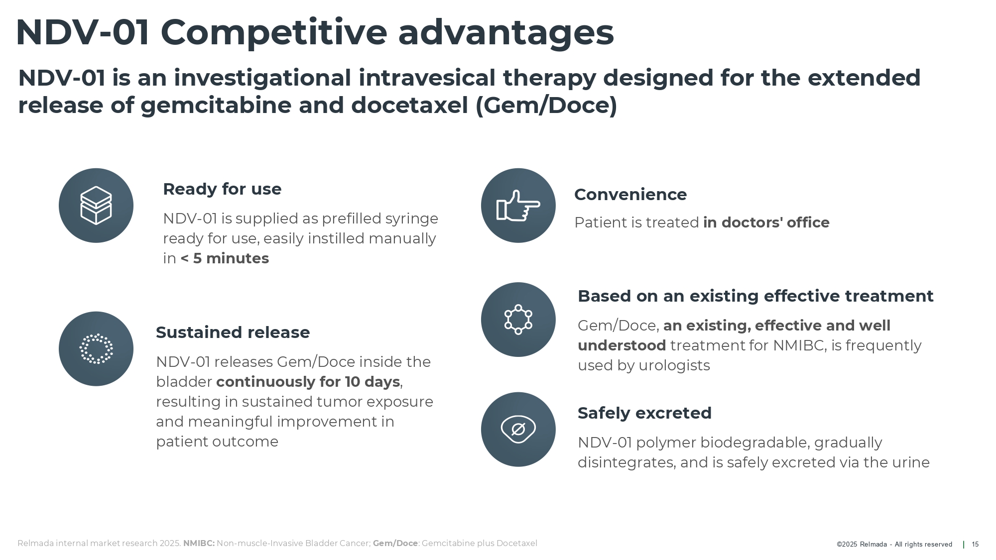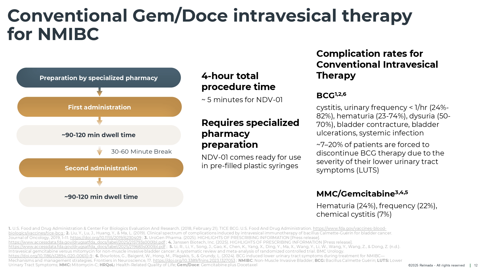 ©2025 Relmada - All rights reserved Conventional Gem/Doce intravesical therapy for NMIBC 12 4 - hour total procedure time ~ 5 minutes for NDV - 01 Requires specialized pharmacy preparation NDV - 01 comes ready for use in pre - filled plastic syringes First administration Preparation by specialized pharmacy ~90 - 120 min dwell time Second administration ~90 - 120 min dwell time Complication rates for Conventional Therapy BCG 1,2,6 cystitis, urinary frequency < 1/hr (24% - 82%), hematuria (23 - 74%), dysuria (50 - 70%), bladder contracture, bladder ulcerations, systemic infection ~7 – 20% of patients are forced to discontinue BCG therapy due to the severity of their lower urinary tract symptoms (LUTS) MMC/Gemcitabine 3,4,5 Hematuria, frequency, chemical cystitis 1. U.S. Food and Drug Administration & Center For Biologics Evaluation And Research. (2018, February 21). TICE BCG. U.S. Food And Drug Administration. https://www.fda.gov/vaccines - blood - biologics/vaccines/tice - bcg ; 2. Liu, Y., Lu, J., Huang, Y., & Ma, L. (2019). Clinical spectrum of complications induced by intravesical immunotherapy of bacillus Calmette - Guérin for bladder cancer. Journal of Oncology, 2019, 1 – 11. https://doi.org/10.1155/2019/6230409 ; 3. UroGen Pharma. (2025). HIGHLIGHTS OF PRESCRIBING INFORMATION [Press release]. https://www.accessdata.fda.gov/drugsatfda_docs/label/2025/215793s000lbl.pdf ; 4. Janssen Biotech, Inc. (2025). HIGHLIGHTS OF PRESCRIBING INFORMATION [Press release]. https://www.accessdata.fda.gov/drugsatfda_docs/label/2025/219683s000lbl.pdf ; 5. Li, R., Li, Y., Song, J., Gao, K., Chen, K., Yang, X., Ding, Y., Ma, X., Wang, Y., Li, W., Wang, Y., Wang, Z., & Dong, Z. (n.d.). Intravesical gemcitabine versus mitomycin for non - muscle invasive bladder cancer: A systematic review and meta - analysis of randomized controlled trial. BMC Urology. https://doi.org/10.1186/s12894 - 020 - 00610 - 9 ; 6. Bourlotos, G., Baigent, W., Hong, M., Plagakis, S., & Grundy, L. (2024). BCG induced lower urinary tract symptoms during treatment for NMIBC — Mechanisms and management strategies. Frontiers in Neuroscience, 17. https://doi.org/10.3389/fnins.2023.1327053 ; NMIBC : Non - Muscle Invasive Bladder; BCG: Bacillus Calmette Guérin; LUTS: Lower Urinary Tract Symptoms; MMC: Mitomycin - C; HRQoL: Health - Related Quality of Life; Gem/Doce : Gemcitabine plus Docetaxel 30 - 60 Minute Break