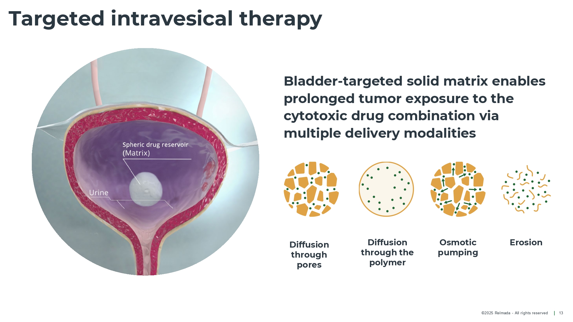©2025 Relmada - All rights reserved Targeted intravesical therapy 13 Diffusion through pores Diffusion through the polymer Osmotic pumping Erosion Bladder - targeted solid matrix enables prolonged tumor exposure to the cytotoxic drug combination via multiple delivery modalities