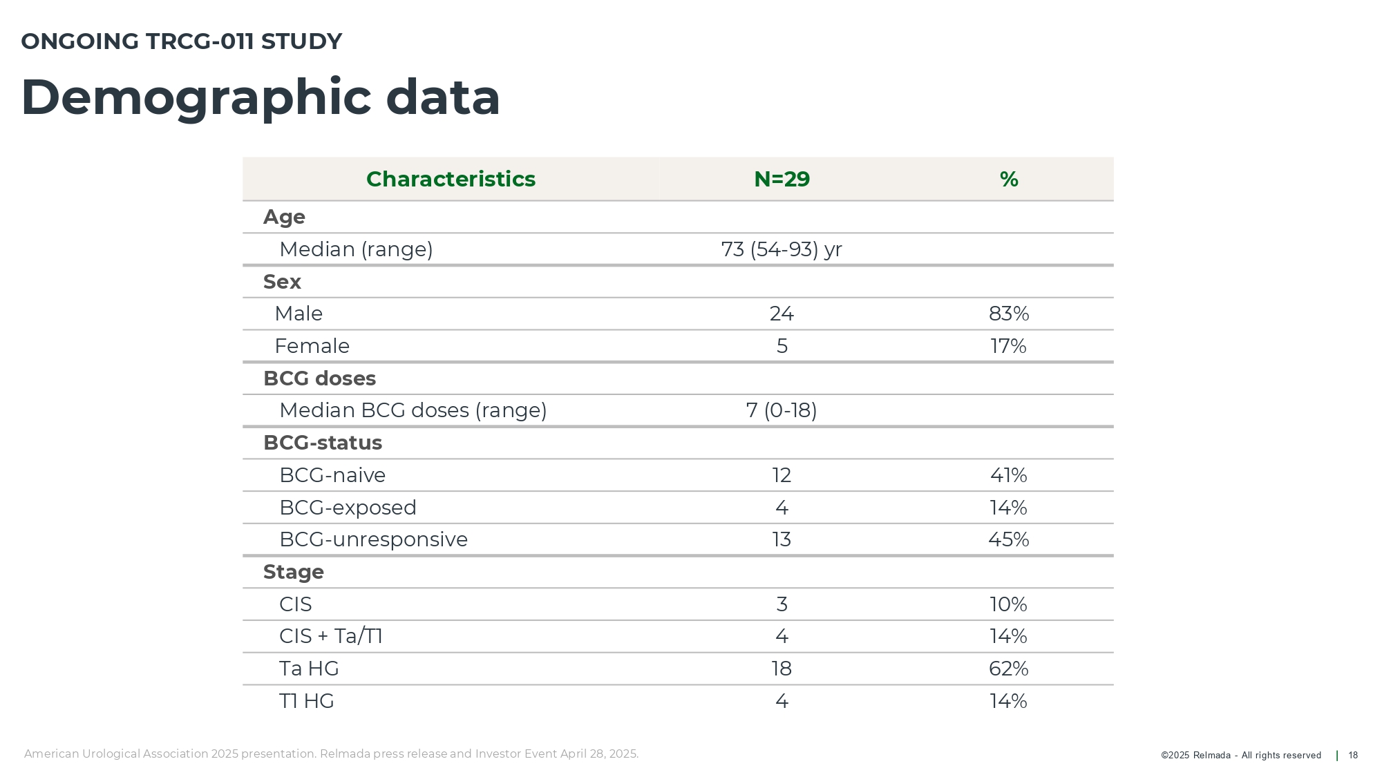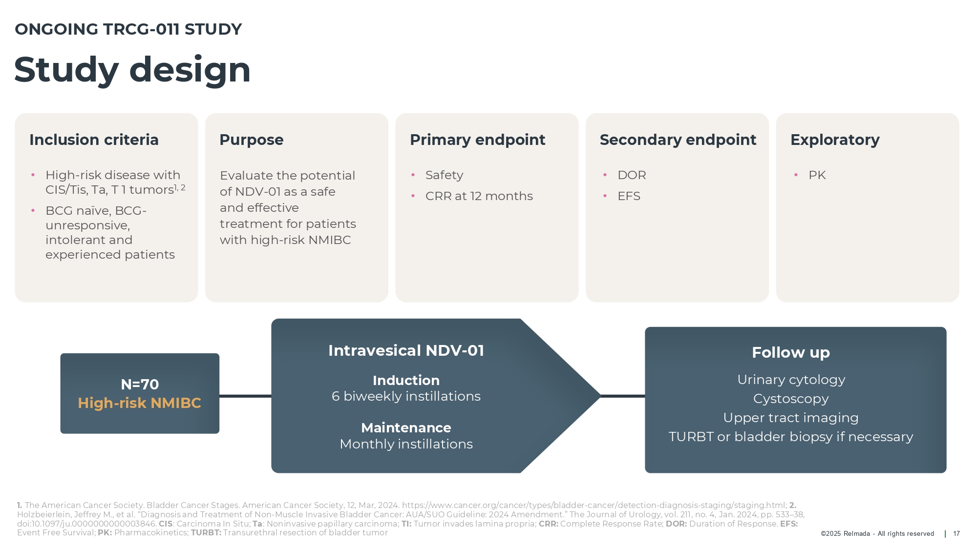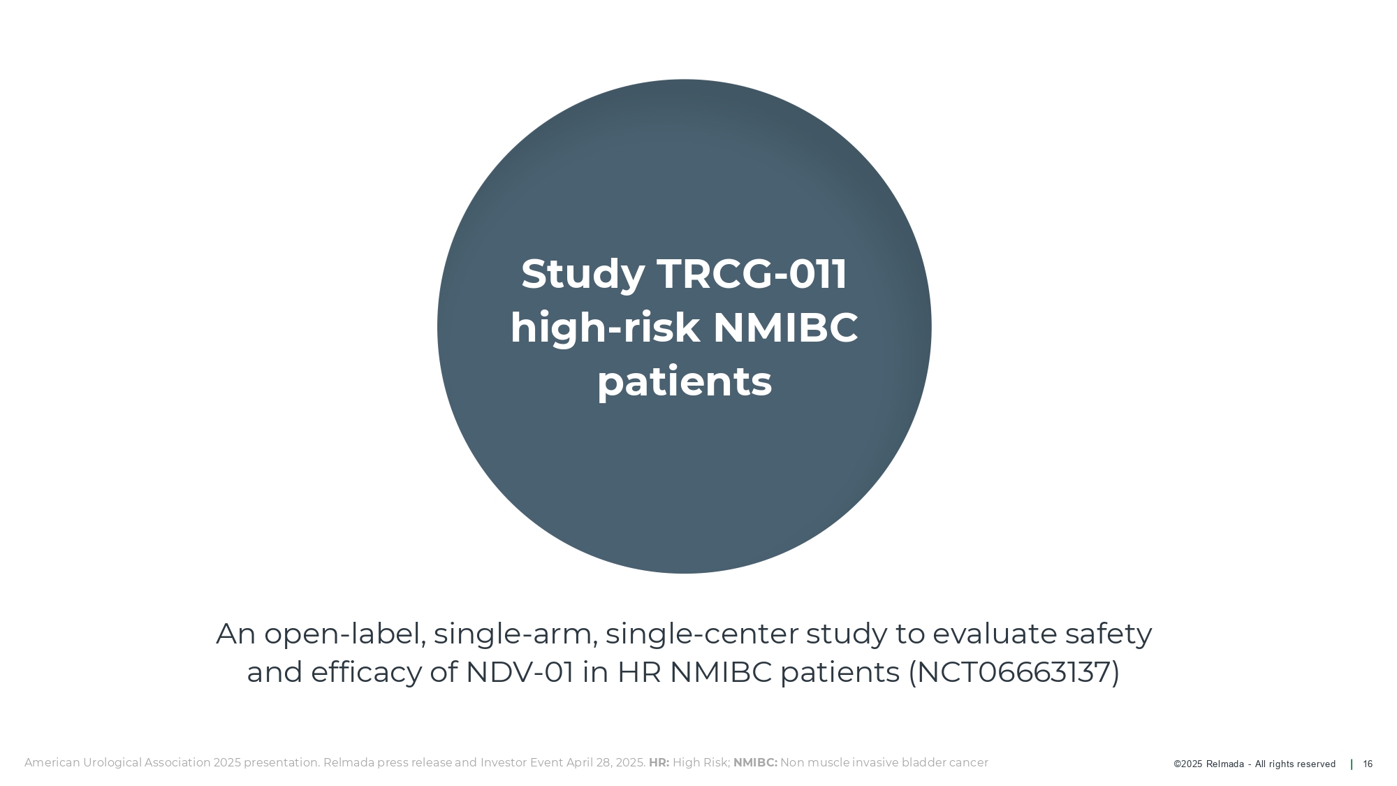 ©2025 Relmada - All rights reserved 16 Study TRCG - 011 high - risk NMIBC patients An open - label, single - arm, single - center study to evaluate safety and efficacy of NDV - 01 in HR NMIBC patients (NCT06663137) American Urological Association 2025 presentation. Relmada press release and Investor Event April 28, 2025. HR: High Risk; NMIBC: Non muscle invasive bladder cancer