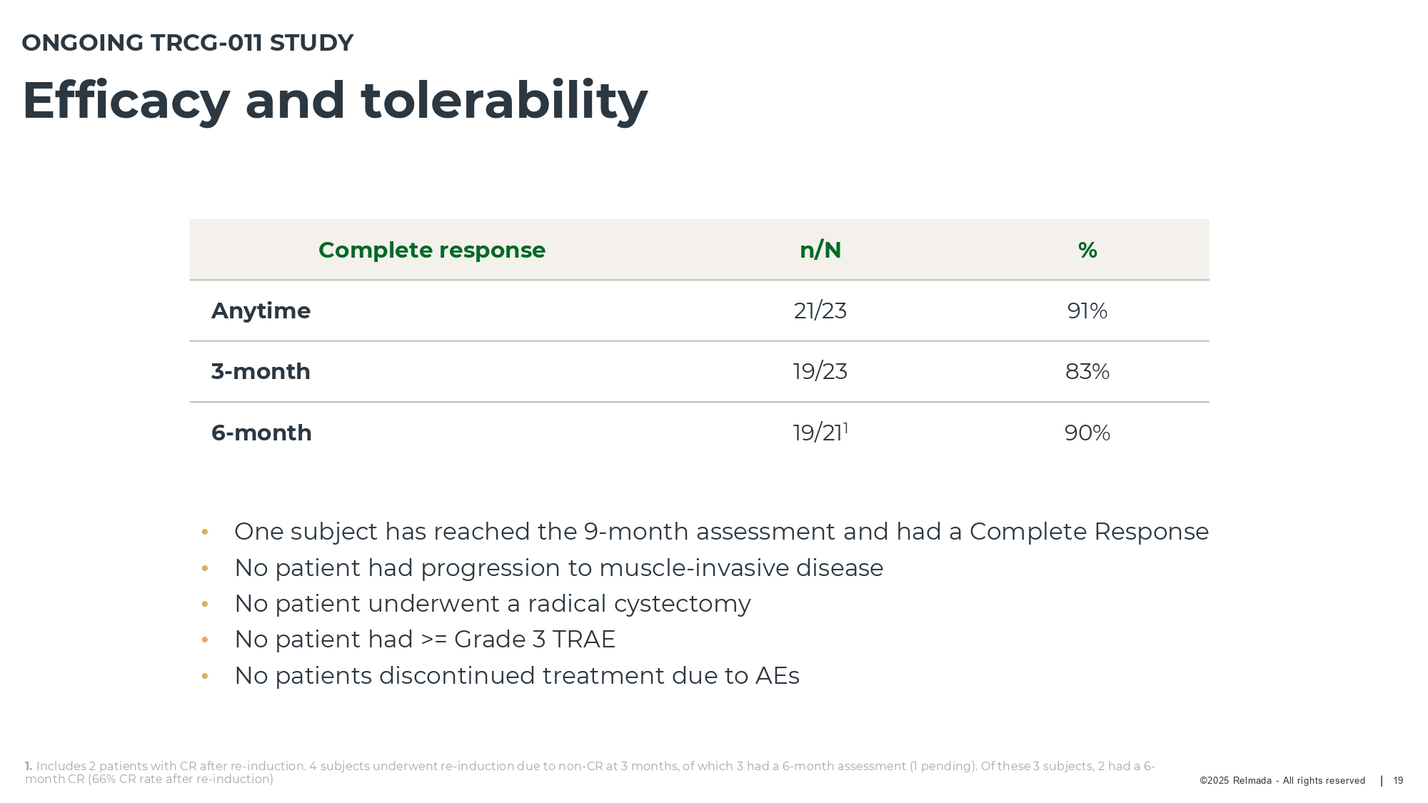©2025 Relmada - All rights reserved ONGOING TRCG - 011 STUDY Demographic data 18 American Urological Association 2025 presentation. Relmada press release and Investor Event April 28, 2025. % N=29 Characteristics Age 73 (54 - 93) yr Median (range) Sex 83% 24 Male 17% 5 Female BCG doses 7 (0 - 18) Median BCG doses (range) BCG - status 41% 12 BCG - naive 14% 4 BCG - exposed 45% 13 BCG - unresponsive Stage 10% 3 CIS 14% 4 CIS + Ta/T1 62% 18 Ta HG 14% 4 T1 HG