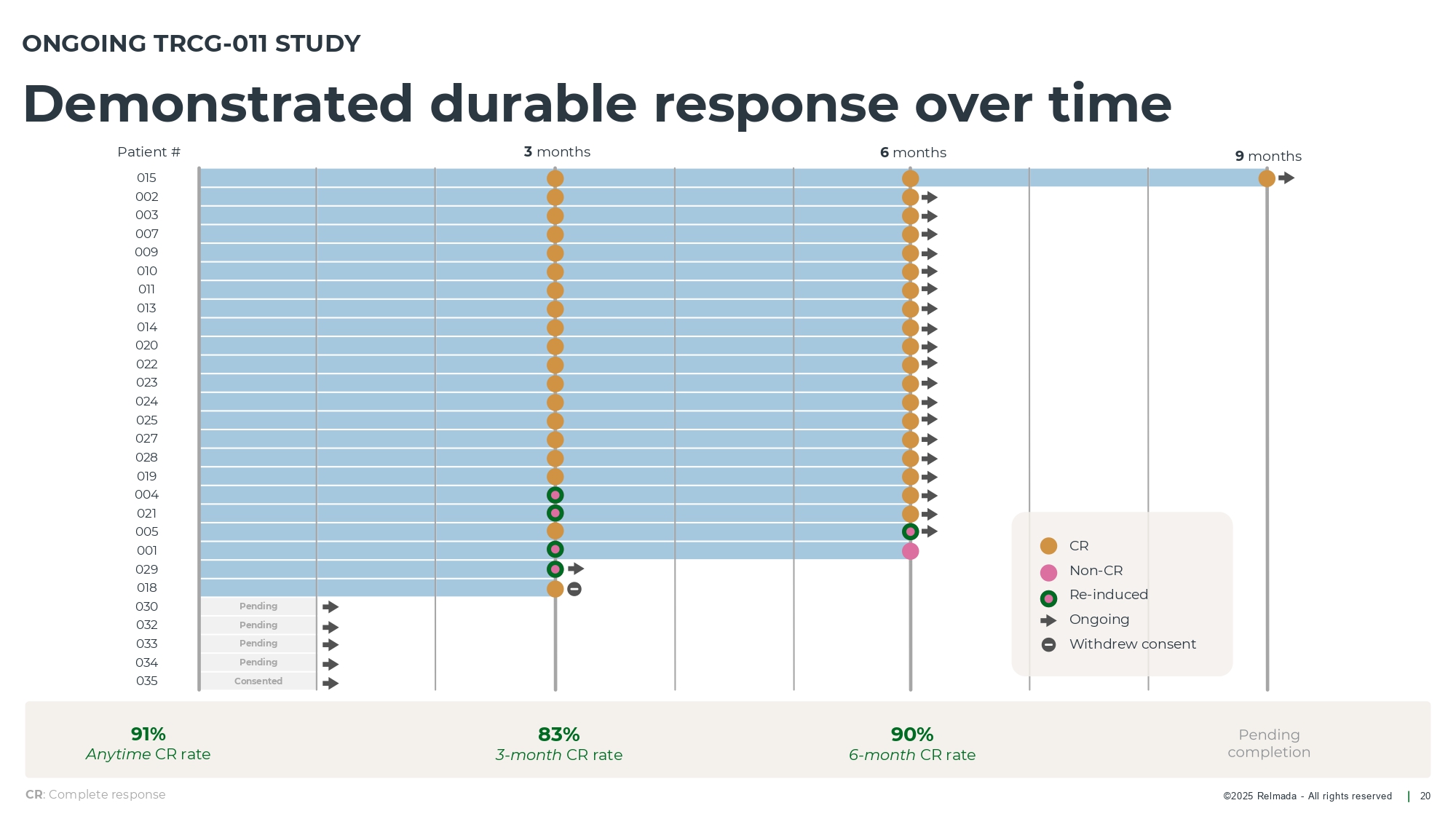 ©2025 Relmada - All rights reserved ONGOING TRCG - 011 STUDY Efficacy and tolerability 19 1. Includes 2 patients with CR after re - induction. 4 subjects underwent re - induction due to non - CR at 3 months, of which 3 had a 6 - month assessment (1 pending). Of these 3 subjects, 2 had a 6 - month CR (66% CR rate after re - induction) % n/N Complete response 91% 21/23 Anytime 83% 19/23 3 - month 90% 19/21 1 6 - month • One subject has reached the 9 - month assessment and had a Complete Response • No patient had progression to muscle - invasive disease • No patient underwent a radical cystectomy • No patient had >= Grade 3 TRAE • No patients discontinued treatment due to AEs