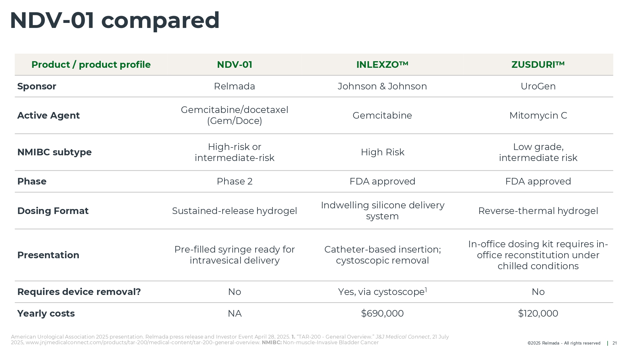 ©2025 Relmada - All rights reserved NDV - 01 compared 21 American Urological Association 2025 presentation. Relmada press release and Investor Event April 28, 2025. 1. “TAR - 200 - General Overview.” J&J Medical Connect , 21 July 2025, www.jnjmedicalconnect.com/products/tar - 200/medical - content/tar - 200 - general - overview. NMIBC: Non - muscle - Invasive Bladder Cancer ZUSDURI INLEXZO NDV - 01 Product / product profile UroGen Johnson & Johnson Relmada Sponsor Mitomycin C Gemcitabine Gemcitabine/docetaxel (Gem/Doce) Active Agent Low grade, intermediate risk High Risk High - risk or intermediate - risk NMIBC subtype FDA approved FDA approved Phase 2 Phase Reverse - thermal hydrogel Indwelling silicone delivery system Sustained - release hydrogel Dosing Format In - office dosing kit requires in - office reconstitution under chilled conditions Catheter - based insertion; cystoscopic removal Pre - filled syringe ready for intravesical delivery Presentation No Yes, via cystoscope 1 No Requires device removal? $120,000 $690,000 NA Yearly costs