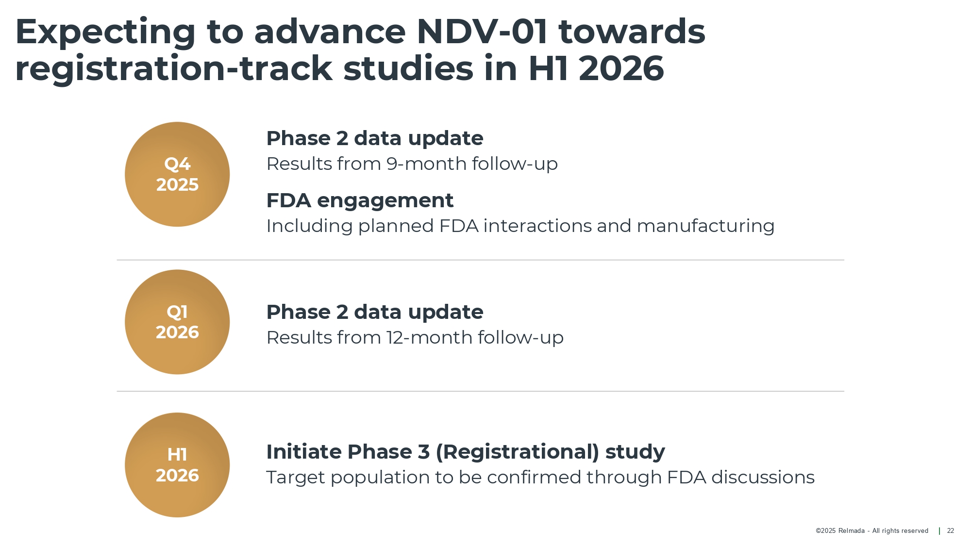 ©2025 Relmada - All rights reserved Expecting to advance NDV - 01 towards registration - track studies in H1 2026 22 Phase 2 data update Results from 9 - month follow - up FDA engagement Including planned FDA interactions and manufacturing Initiate Phase 3 study Target population to be confirmed through FDA discussions Phase 2 data update Results from 12 - month follow - up Q4 2025 Q1 2026 H1 2026
