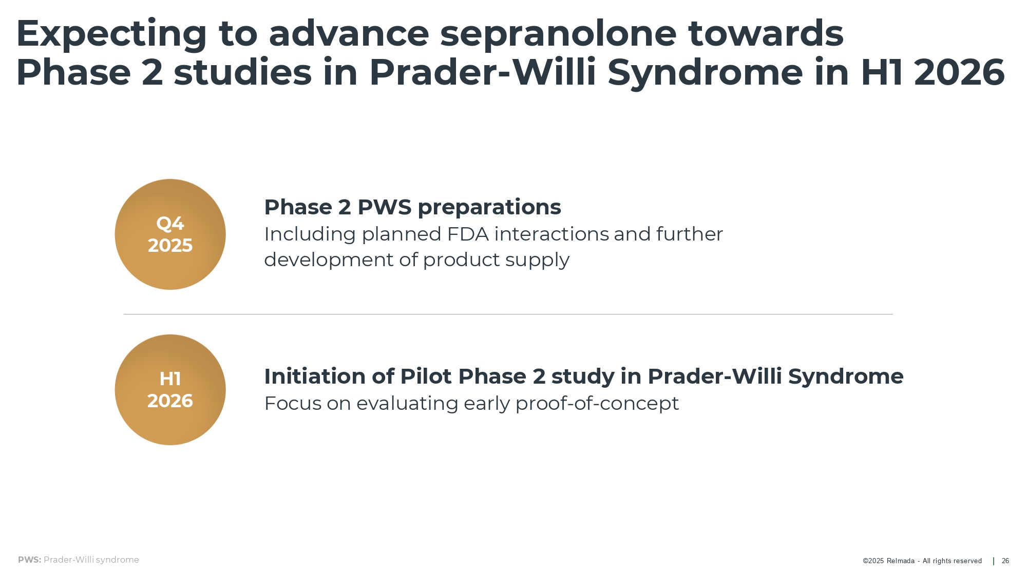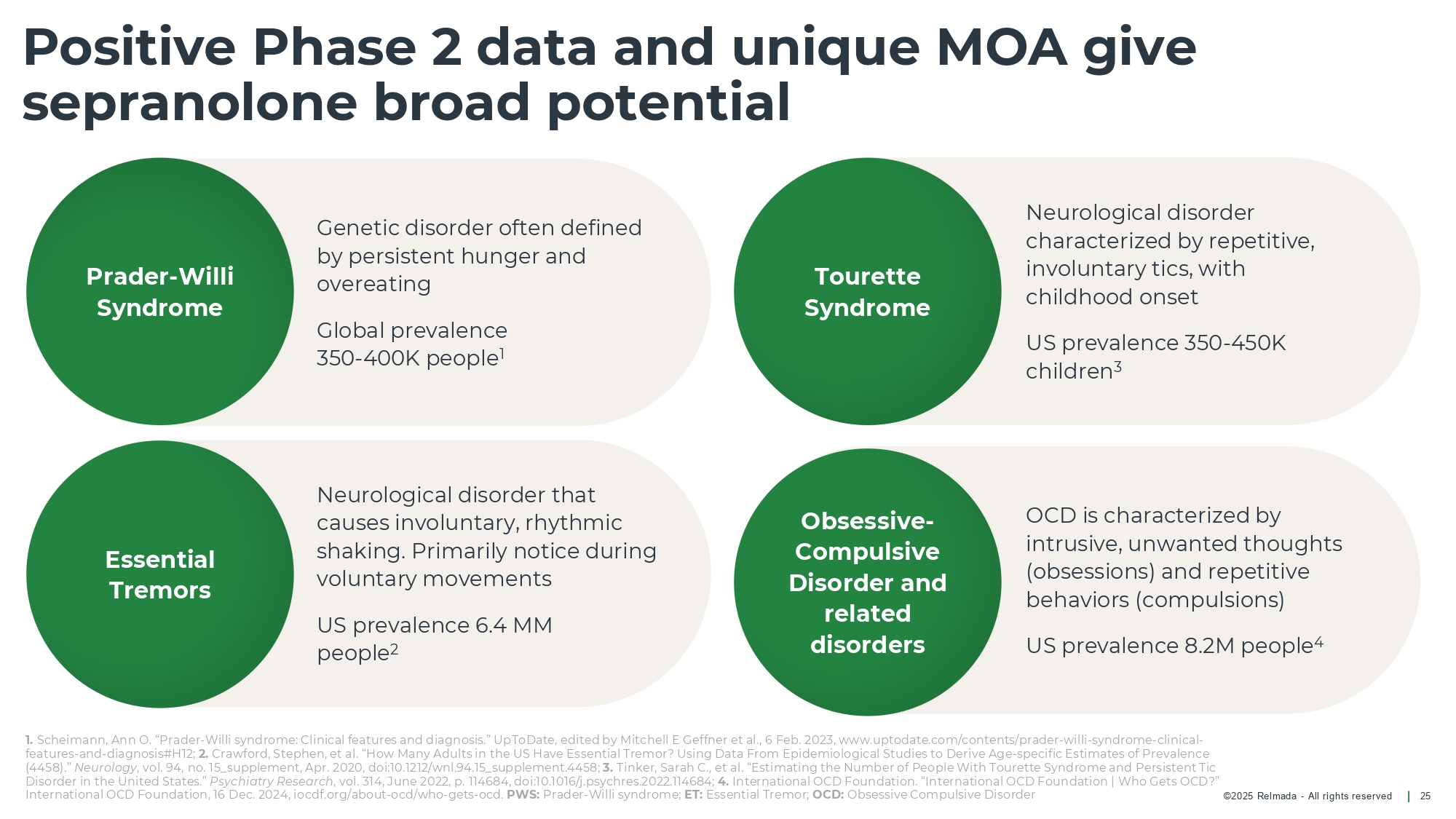 ©2025 Relmada - All rights reserved OCD is characterized by intrusive, unwanted thoughts (obsessions) and repetitive behaviors (compulsions) US prevalence 8.2M people 4 Neurological disorder characterized by repetitive, involuntary tics, with childhood onset US prevalence 350 - 450K children 3 Neurological disorder that causes involuntary, rhythmic shaking. Primarily notice during voluntary movements US prevalence 6.4 MM people 2 Genetic disorder often defined by persistent hunger and overeating Global prevalence 350 - 400K people 1 Positive Phase 2 data and unique MOA give sepranolone broad potential 25 Prader - Willi Syndrome Essential Tremors Tourette Syndrome Obsessive - Compulsive Disorder and related disorders 1. Scheimann, Ann O. “Prader - Willi syndrome: Clinical features and diagnosis.” UpToDate, edited by Mitchell E Geffner et al., 6 Feb. 2023, www.uptodate.com/contents/prader - willi - syndrome - clinical - features - and - diagnosis#H12; 2. Crawford, Stephen, et al. “How Many Adults in the US Have Essential Tremor? Using Data From Epidemiological Studies to Derive Age - specific Estimates of Prevalence (4458).” Neurology , vol. 94, no. 15_supplement, Apr. 2020, doi:10.1212/wnl.94.15_supplement.4458; 3. Tinker, Sarah C., et al. “Estimating the Number of People With Tourette Syndrome and Persistent Tic Disorder in the United States.” Psychiatry Research , vol. 314, June 2022, p. 114684, doi:10.1016/j.psychres.2022.114684; 4. International OCD Foundation. “International OCD Foundation | Who Gets OCD?” International OCD Foundation, 16 Dec. 2024, iocdf.org/about - ocd/who - gets - ocd. PWS: Prader - Willi syndrome; ET: Essential Tremor; OCD: Obsessive Compulsive Disorder