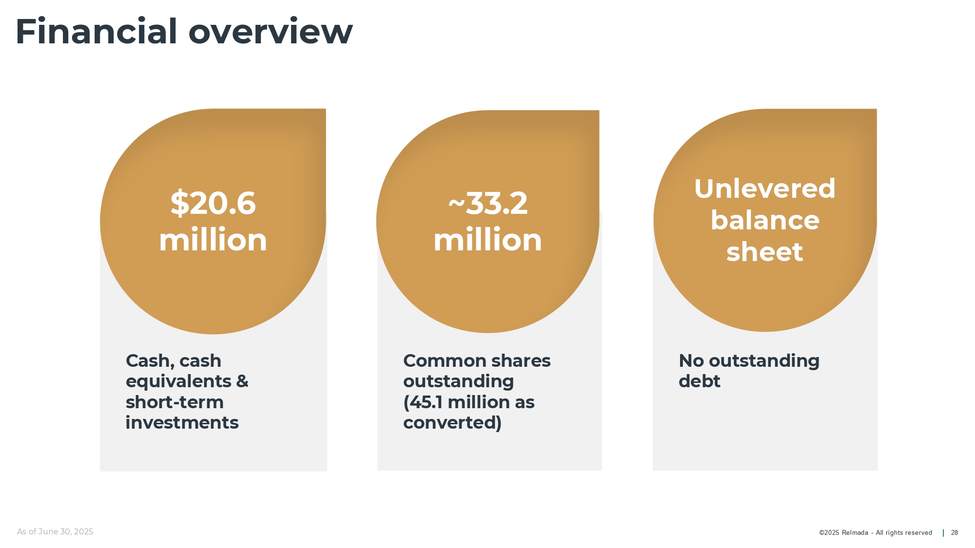 ©2025 Relmada - All rights reserved Financial overview 28 Common shares outstanding (45.1 million as converted) Cash, cash equivalents & short - term investments As of June 30, 2025 No outstanding debt $20.6 million ~33.2 million Unlevered balance sheet