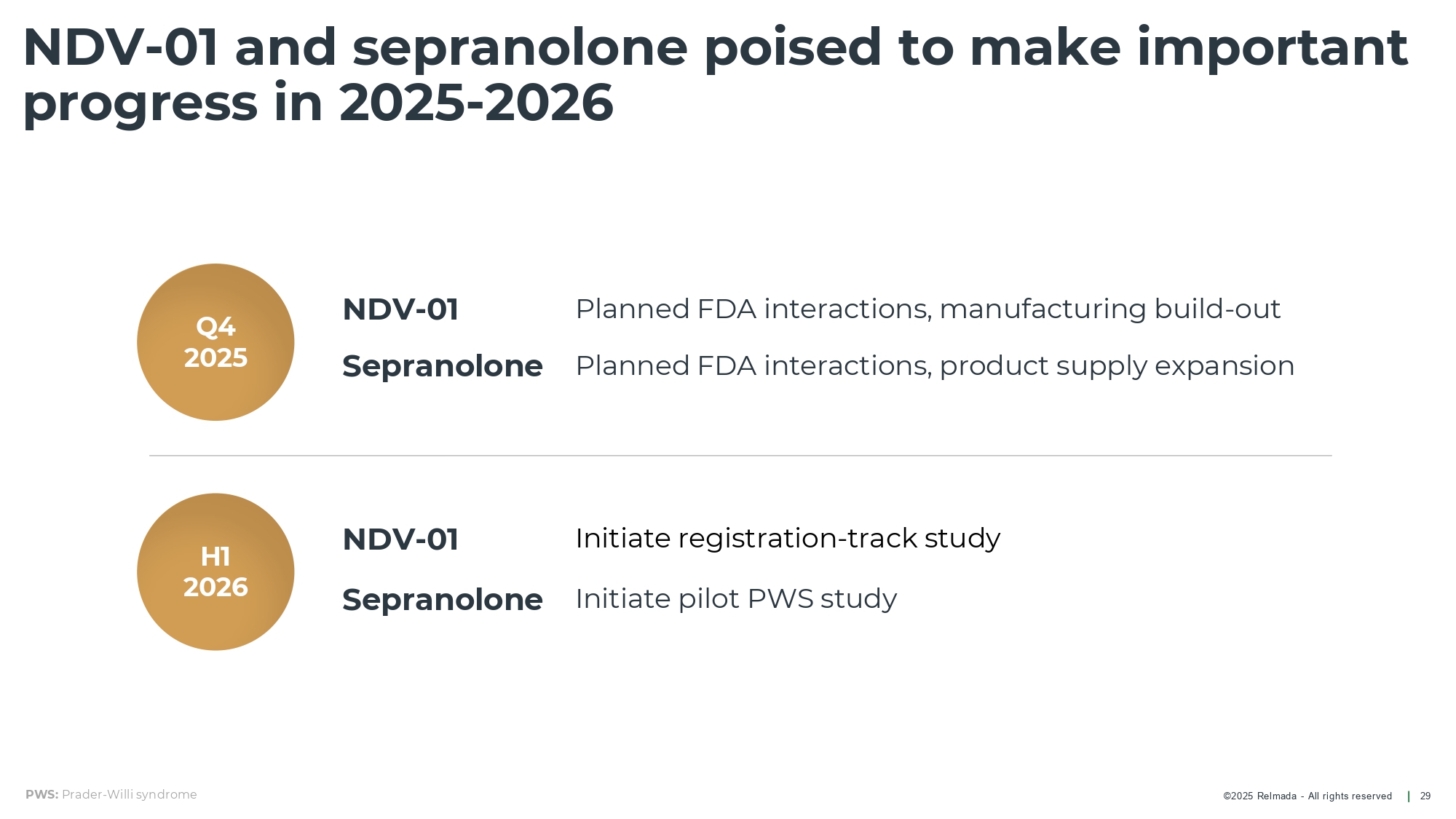 ©2025 Relmada - All rights reserved Expecting to advance sepranolone towards Phase 2 studies in Prader - Willi Syndrome in H1 2026 26 Phase 2 PWS preparations Including planned FDA interactions and further development of product supply Initiation of Pilot Phase 2 study in Prader - Willi Syndrome Focus on evaluating early proof - of - concept PWS: Prader - Willi syndrome Q4 2025 H1 2026