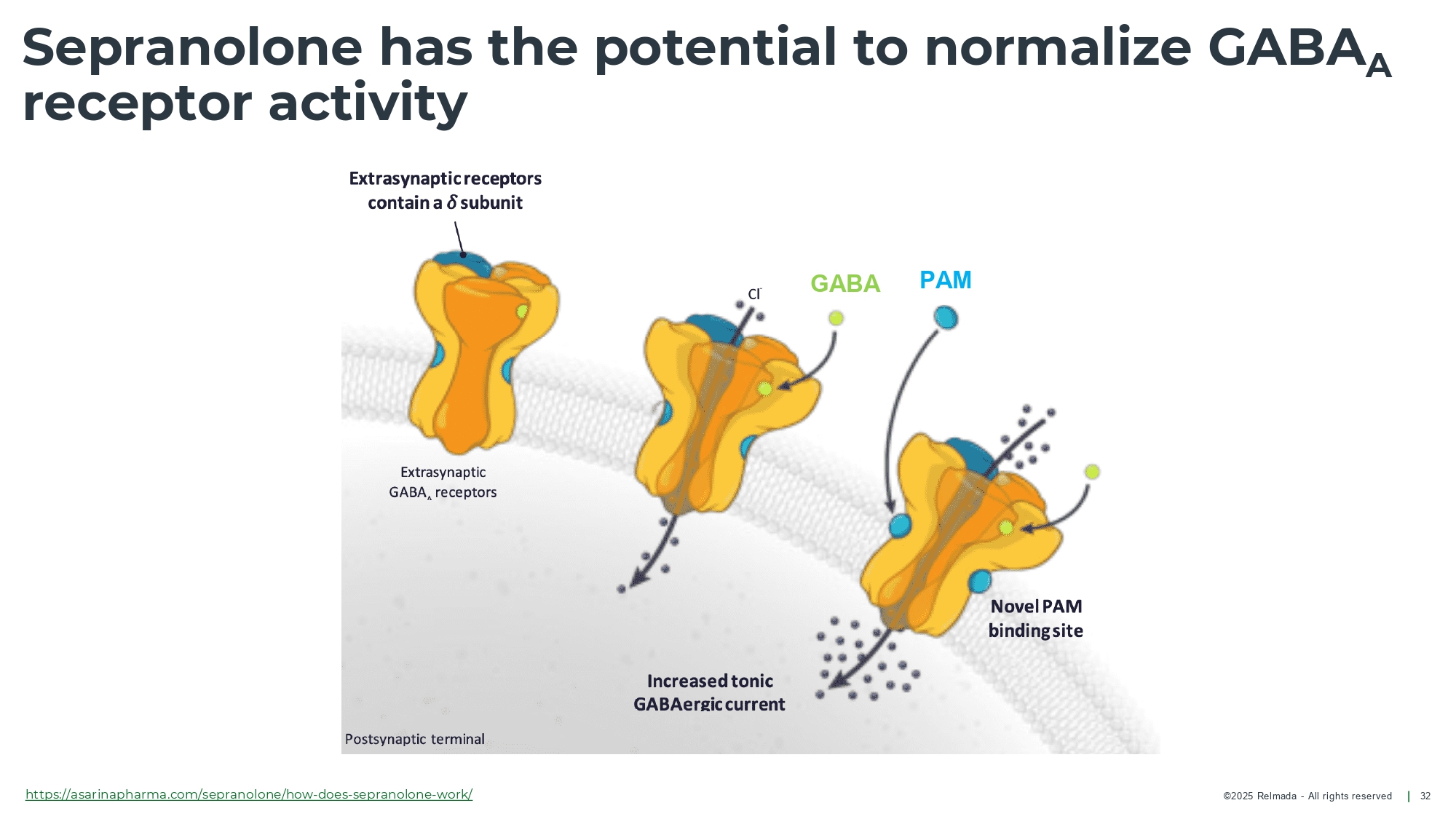 ©2025 Relmada - All rights reserved Sepranolone has the potential to normalize GABA A receptor activity 32 GABA PAM https://asarinapharma.com/sepranolone/how - does - sepranolone - work/