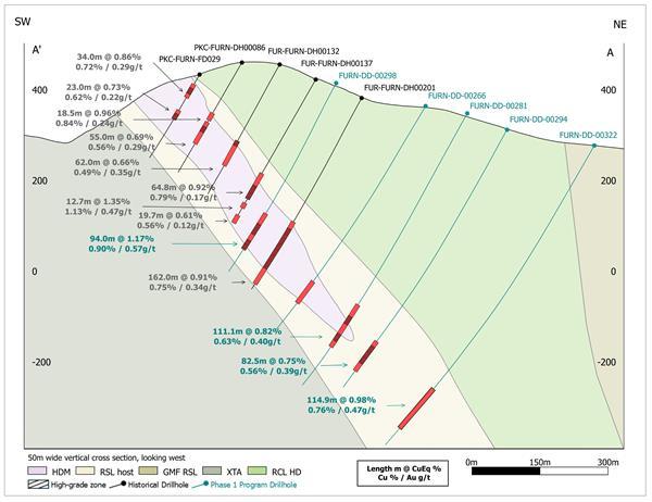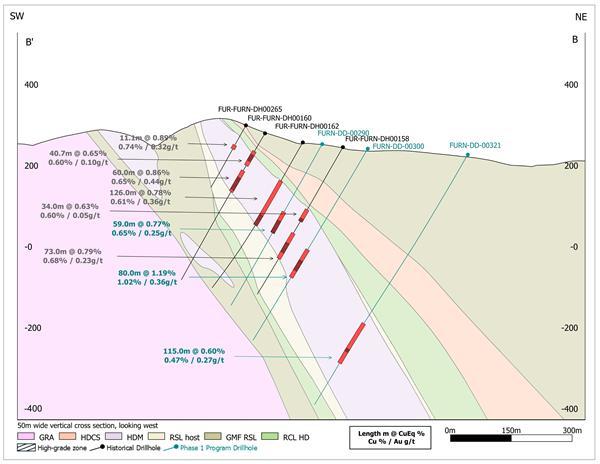 Complete results from the Phase 1 program are highlighted by intercepts that continue to demonstrate high-grade continuity throughout the deposit as well as significantly extend the known limits of mineralization within the high-grade zones (greater than 1% CuEq1) to depth. To date, mineralization has been extended to a depth of approximately 950 meters down-dip from surface and remains open.