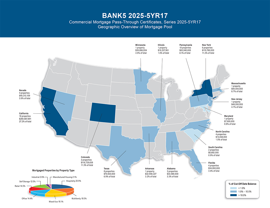 J.P. Morgan Chase Commercial Mortgage Securities Corp. is offering certain classes of the Commercial Mortgage Pass-Through Certificates, Series 2025-5YR17 consisting of the certificate classes identified in the table below. The certificates being offered by this prospectus (and the non-offered certificates identified under “Summary of Certificates and VRR Interest”) and the VRR Interest represent the beneficial ownership interests in the issuing entity, which will be a New York common law trust named BANK5 2025-5YR17. The assets of the issuing entity will primarily consist of a pool of fixed-rate commercial mortgage loans, which are generally the sole source of payments on the certificates and the VRR Interest. Credit enhancement will be provided solely by certain classes of subordinate certificates that will be subordinate to certain classes of senior certificates as described under “Description of the Certificates—Subordination; Allocation of Realized Losses”. Each class of certificates and the VRR Interest will be entitled to receive monthly distributions of interest and/or principal on the 4th business day following the 11th day of each month (or if the 11th day is not a business day, the next business day), commencing in November 2025. The rated final distribution date for the certificates is the distribution date in November 2058.