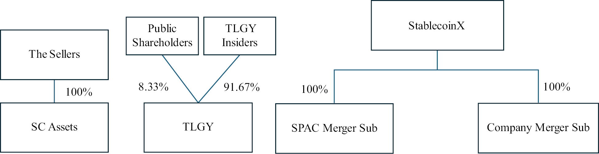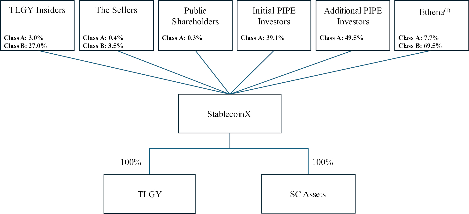 Immediately following the Closing, (1) all StablecoinX Class A Common Stock will be held by (a) former holders of Public Shares (the “Public Shareholders”), (b) the TLGY Insiders, (c) the former holders of SC Assets Class B Common Stock (the “Sellers”), (d) the PIPE Investors (as defined below) and (e) the Ethena Foundation (“Ethena”) and (2) all StablecoinX Class B Common Stock will be held by (a) Ethena, (b) the TLGY Insiders, and (c) the Sellers. See “— Potential conflicts of interest in connection with the Business Combination” below and the section entitled “Description of StablecoinX’s Securities” for more information.