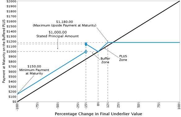 Downside Scenario | The final underlier value is less than the buffer value. In this case, at maturity, we will pay less than the stated principal amount and the percentage loss of the stated principal amount will be equal to the percentage decrease from the initial underlier value to the final underlier value in excess of the buffer amount of 15%. The minimum payment at maturity is $150.00 per Buffered PLUS. |