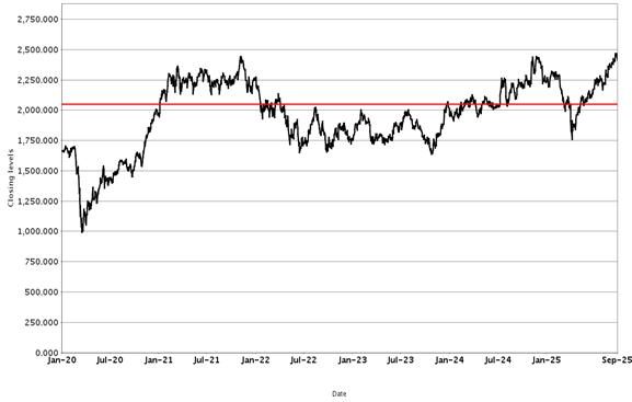 The Russell 2000® Index – Historical Closing Values January 2, 2020 to September 25, 2025 |