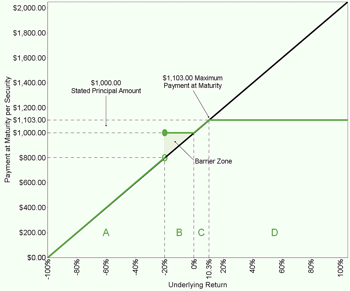 If the final underlying value is less than or equal to the initial underlying value but greater than or equal to the final barrier value: $1,000
