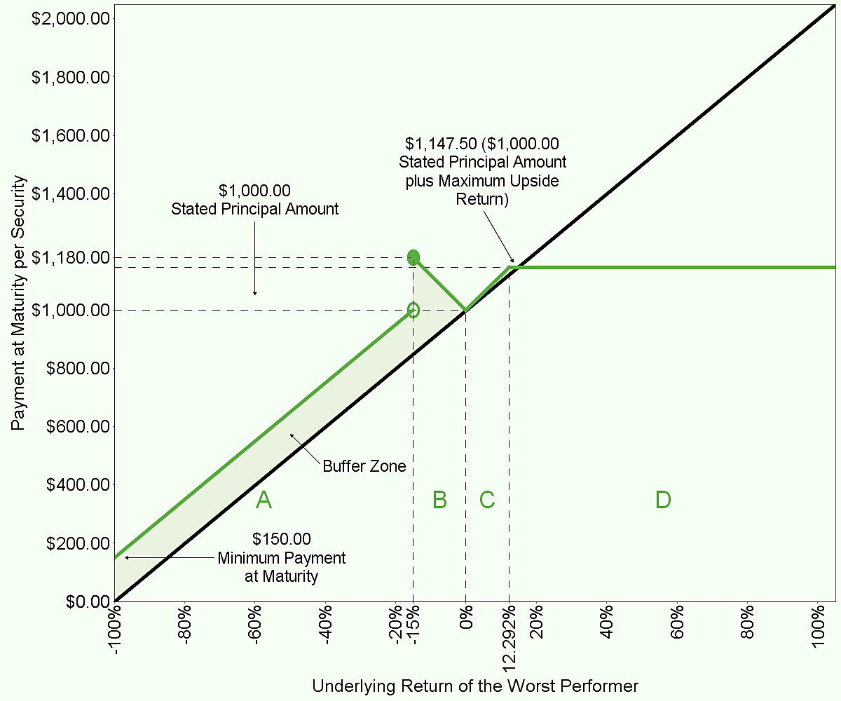 The maximum upside return will be determined on the pricing date and will be at least $147.50 per security (at least 14.75% of the stated principal amount). If the final underlying value of the worst performer is greater than or equal to its initial underlying value, the payment at maturity per security will not exceed the stated principal amount plus the maximum upside return.* |