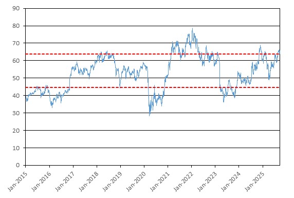 The graph below illustrates the performance of the KRE Fund’s shares from January 1, 2015 through September 25, 2025, based on the daily closing levels as reported by Bloomberg, without independent verification. UBS has not conducted any independent review or due diligence of any publicly available information obtained from Bloomberg. The closing level of the KRE Fund’s shares on September 25, 2025 was $63.89. The dotted lines respectively represent its call threshold level of $63.89, which is equal to 100.00% of its initial level, and its coupon barrier and downside threshold of $44.72, which is equal to 70.00% of its initial level. Past performance of the underlying asset is not indicative of the future performance of the underlying asset during the term of the Notes.