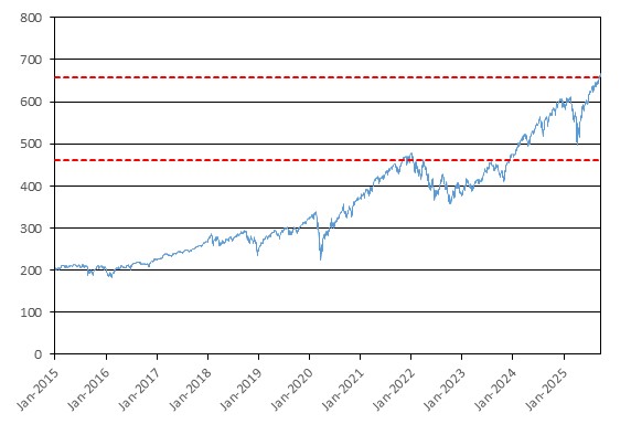 The graph below illustrates the performance of the SPY Trust’s shares from January 1, 2015 through September 25, 2025, based on the daily closing levels as reported by Bloomberg, without independent verification. UBS has not conducted any independent review or due diligence of any publicly available information obtained from Bloomberg. The closing level of the SPY Trust’s shares on September 25, 2025 was $658.05. The dotted lines respectively represent its call threshold level of $658.05, which is equal to 100.00% of its initial level, and its coupon barrier and downside threshold of $460.64, which is equal to 70.00% of its initial level. Past performance of the underlying asset is not indicative of the future performance of the underlying asset during the term of the Notes.