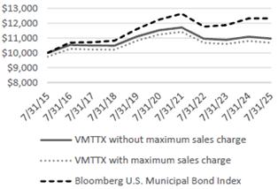 The chart below reflects a hypothetical $10,000 investment in the class of shares noted with and without sales charges.