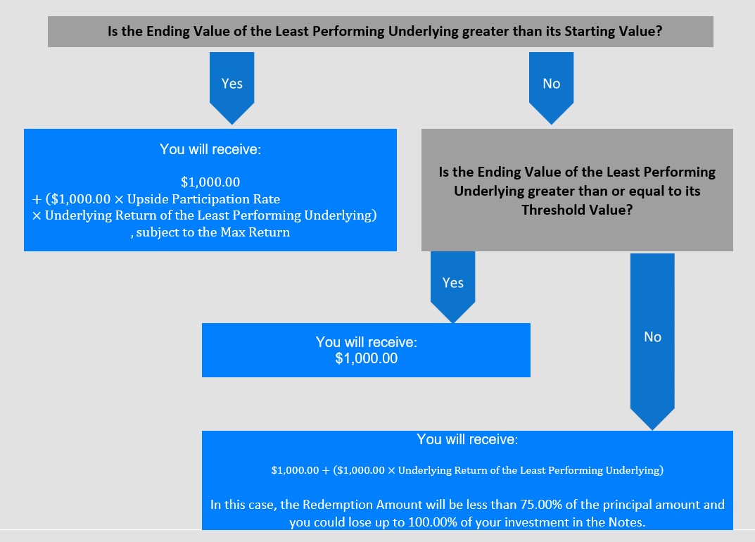 The following table is for purposes of illustration only. It is based on hypothetical values and shows hypothetical returns on the Notes. The table illustrates the calculation of the Redemption Amount and the return on the Notes based on a hypothetical Starting Value of 100 for the Least Performing Underlying, a hypothetical Threshold Value of 75 for the Least Performing Underlying, the Upside Participation Rate of 125.00%, the Max Return of $1,390.00 per $1,000.00 in principal amount of Notes and a range of hypothetical Ending Values of the Least Performing Underlying. The actual amount you receive and the resulting return will depend on the actual Starting Values, Threshold Values and Ending Values of the Underlyings, and whether you hold the Notes to maturity. The following examples do not take into account any tax consequences from investing in the Notes.