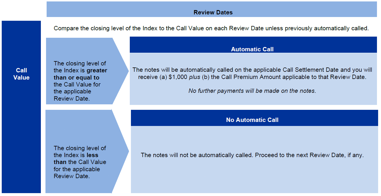 Call Premium Amount: The Call Premium Amount with respect to each Review Date is set forth below: ●first Review Date: 16.2500% × $1,000 ●second Review Date: 20.3125% × $1,000 ●third Review Date: 24.3750% × $1,000 ●fourth Review Date: 28.4375% × $1,000 ●fifth Review Date: 32.5000% × $1,000 ●sixth Review Date: 36.5625% × $1,000 ●seventh Review Date: 40.6250% × $1,000 ●eighth Review Date: 44.6875% × $1,000 ●ninth Review Date: 48.7500% × $1,000 ●tenth Review Date: 52.8125% × $1,000 ●eleventh Review Date: 56.8750% × $1,000 ●twelfth Review Date: 60.9375% × $1,000 ●thirteenth Review Date: 65.0000% × $1,000 ●fourteenth Review Date: 69.0625% × $1,000 ●fifteenth Review Date: 73.1250% × $1,000 ●sixteenth Review Date: 77.1875% × $1,000 ●final Review Date: 81.2500% × $1,000